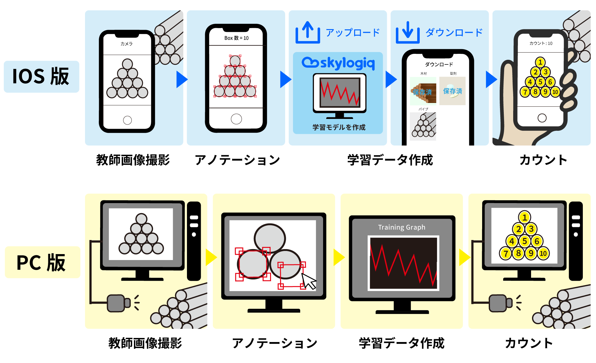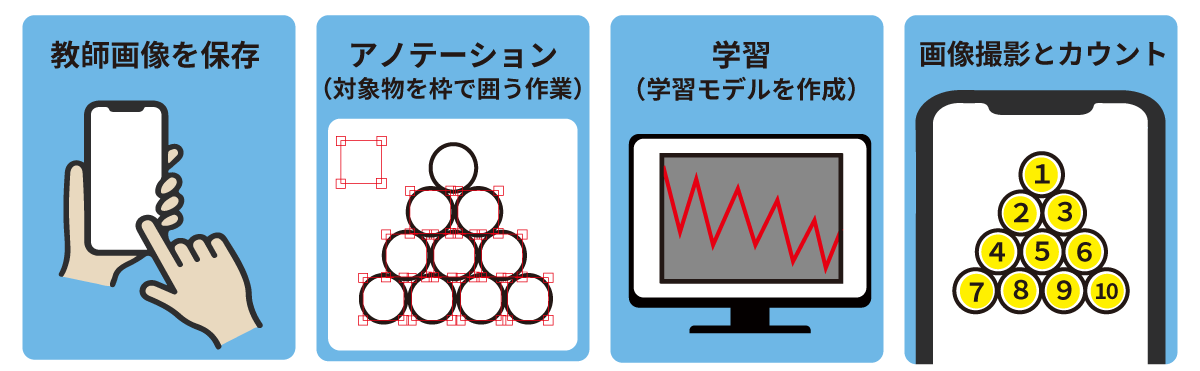 PC版では撮影・アノテーションを行い、カスタム学習モデルを作成は『学習:開始』を押すだけ。アノテーションを行った教師画像を弊社サーバーへアップロードする必要がありません。