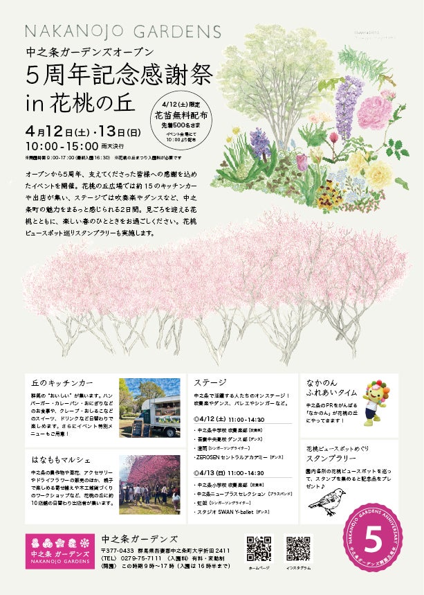 7つの異なる特徴を持つガーデンの複合施設「中之条ガーデンズ」(群馬県 中之条町)は、2025年4月にオープン5周年を迎えます。そこで4月12日(土)、13日(日)に特別イベント「5周年記念感謝祭 in 花桃の丘」を開催。これまで支えてくれた地域への感謝を込め、町内の出店・出演をメインとしたキッチンカーやマルシェ、ステージが集うお祭りです。