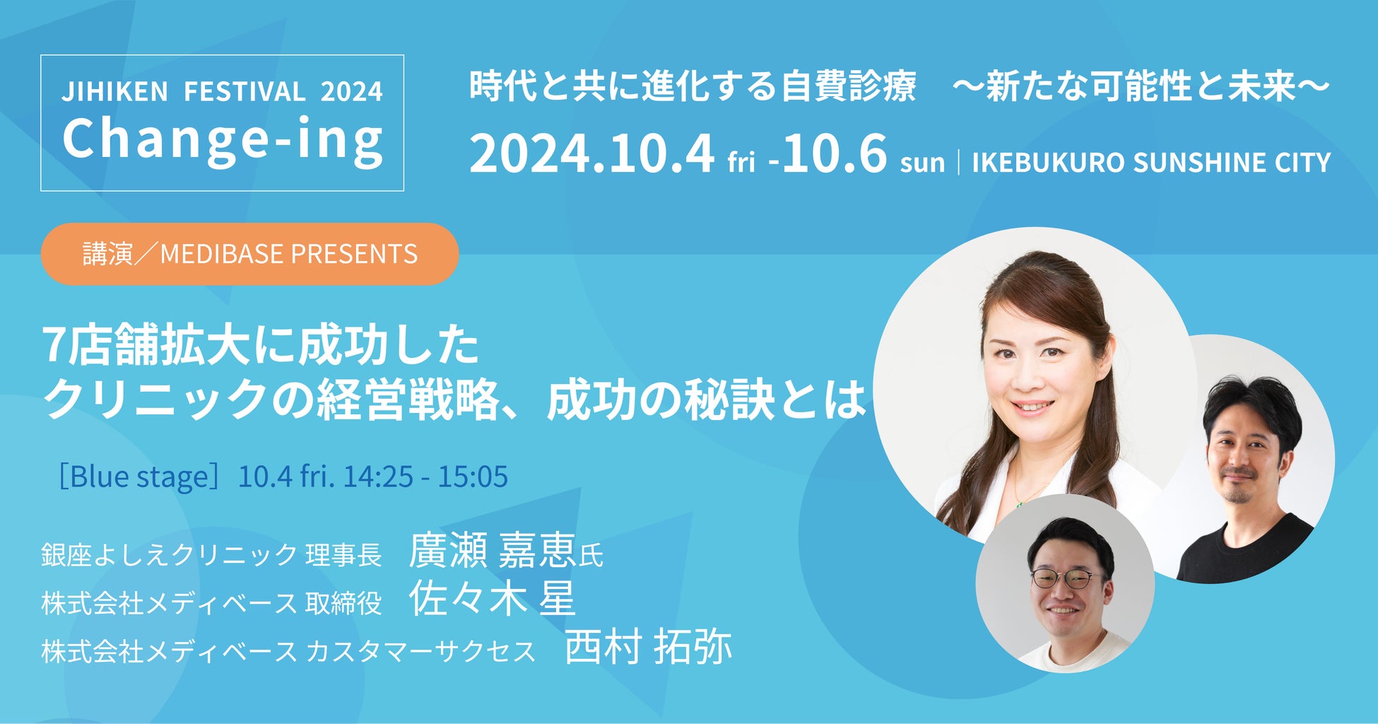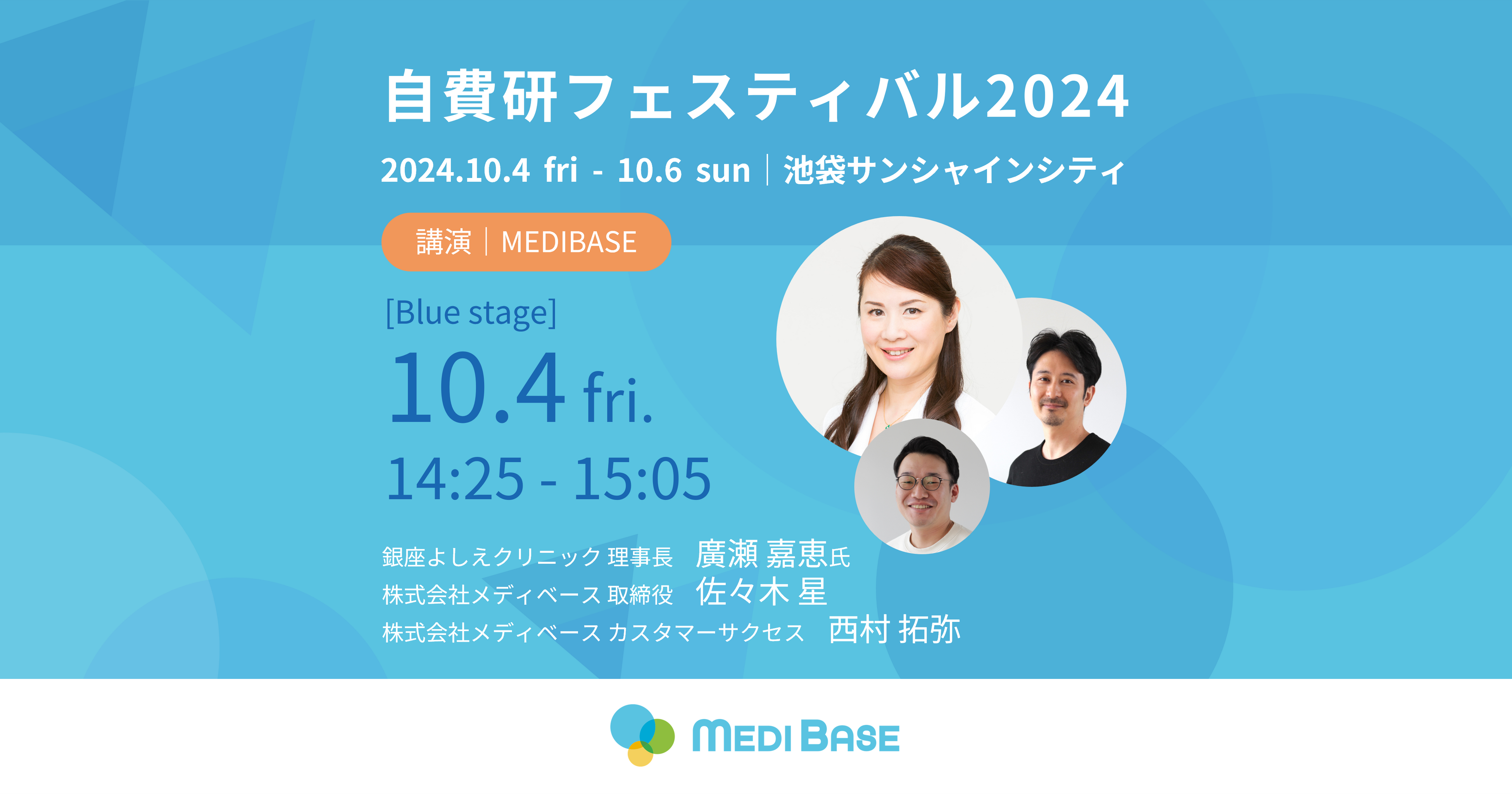 美容・自由診療クリニック向けクラウド型電子カルテ「MEDIBASE(メディベース)」を提供する株式会社メディベース(以下当社)は、2024年10月4日(金)・5日(土)・6日(日)の3日間、 池袋・サンシャインシティにて開催される、自費診療にまつわる情報を正しく発信することを目的として開催されるイベント「自費研フェスティバル2024」にブース出展します。また、10月4日(金)14:25からの当社提供プログラムに、銀座よしえクリニック 理事長 廣瀬 嘉恵氏の登壇が決定しました。アンケートにご回答いただいた方には、素敵なプレゼントをご用意しておりますので、ご来場の際はぜひ当社ブースにお立ち寄りください(プレゼントはなくなり次第終了)。
