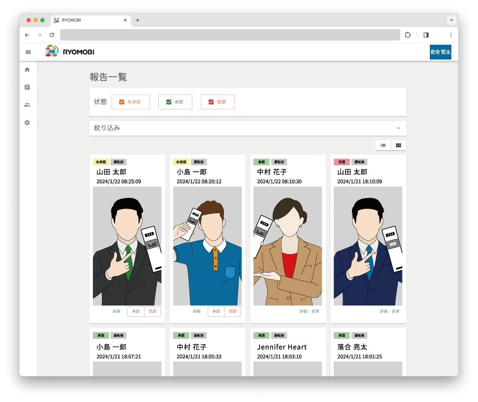 運転する人が計測したアルコールチェック結果は、クラウド上に自動で記録が残ります。安全運転管理者は、WEB上から、いつでもどこからでも承認業務を行えます。報告一覧は、画像付きでわかりやすく表示され、未承認の報告も一目瞭然です。報告の集計や整理も効率よく実施でき、安全運転管理者が記録を保存する手間を大幅に削減できます。