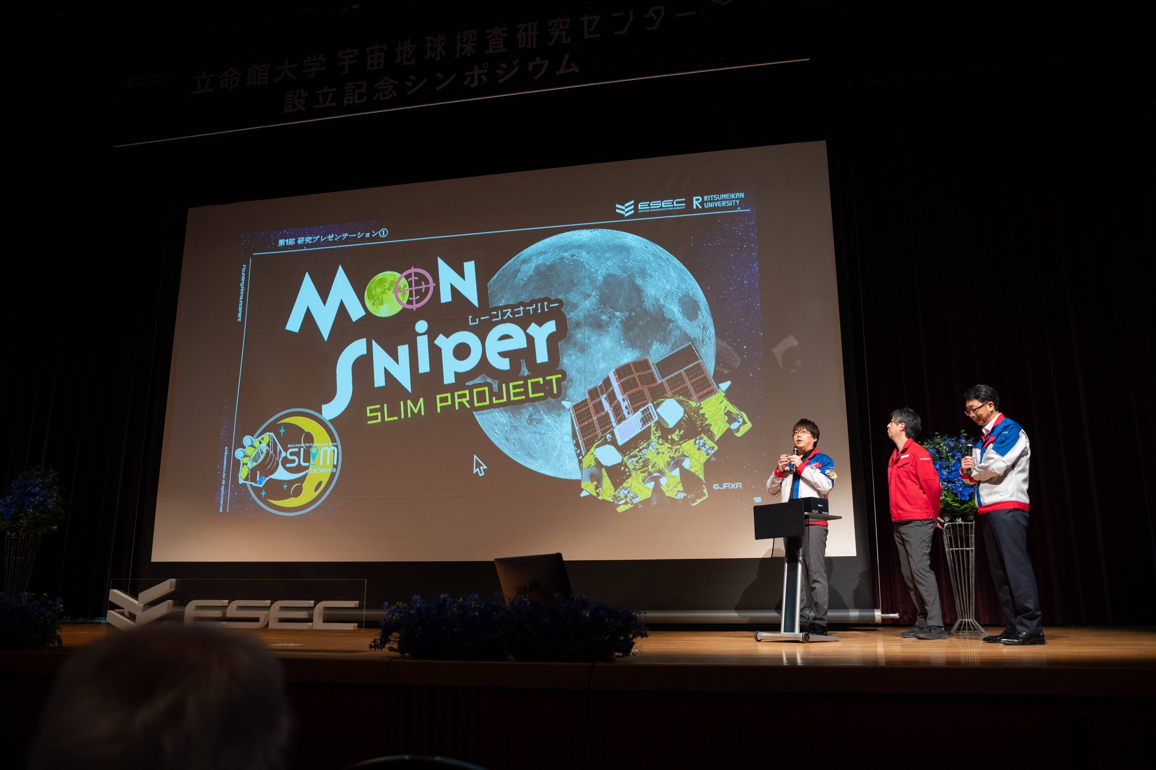 ESECセンター長の佐伯和人教授、長岡央准教授、仲内悠祐助教によるプレゼンテーションでは、「月スナイパーSLIM計画への参加から得られたもの〜今後の月探査・研究の展望」と題し、3人がSLIMの成果やミッションの裏話を明かしました。