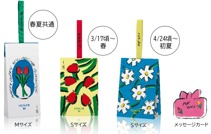 キービジュアルは春や初夏らしく爽やかでメロウなデザイン。ギフトバッグはお求めのギフトアイテムの大きさにあわせてラッピングできる2サイズで展開します。さらにSサイズは春の訪れを感じさせるようなチューリップのデザイン、初夏の爽やかさを思わせるようなマーガレットのデザインの2種をご用意。メッセージカードは、そのまま渡しても喜ばれるデザインが施され、手書きのメッセージも添えられる仕様となっています。