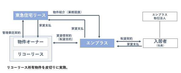そうした両社のノウハウや強みを活かした今回の新たな契約スキームは、東急住宅リースが管理する物件をエンプラスが借り受け、入居者へ転貸することでエンプラスが窓口となり入居者対応を行うことにより、外国籍の方が賃貸住宅に住みやすい環境を提供することができます。