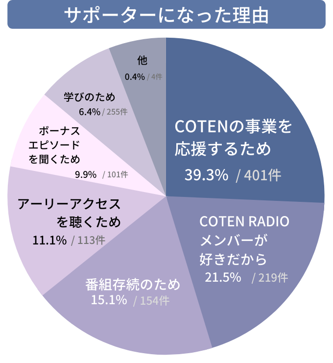 2021年7月にCOTENが行ったリスナーアンケートの結果では、COTEN CREWになった理由のトップは「株式会社COTENの事業を応援するため」であり、自身へのメリットや、番組の存続・パーソナリティが好き、といった回答よりも多い結果となりました。