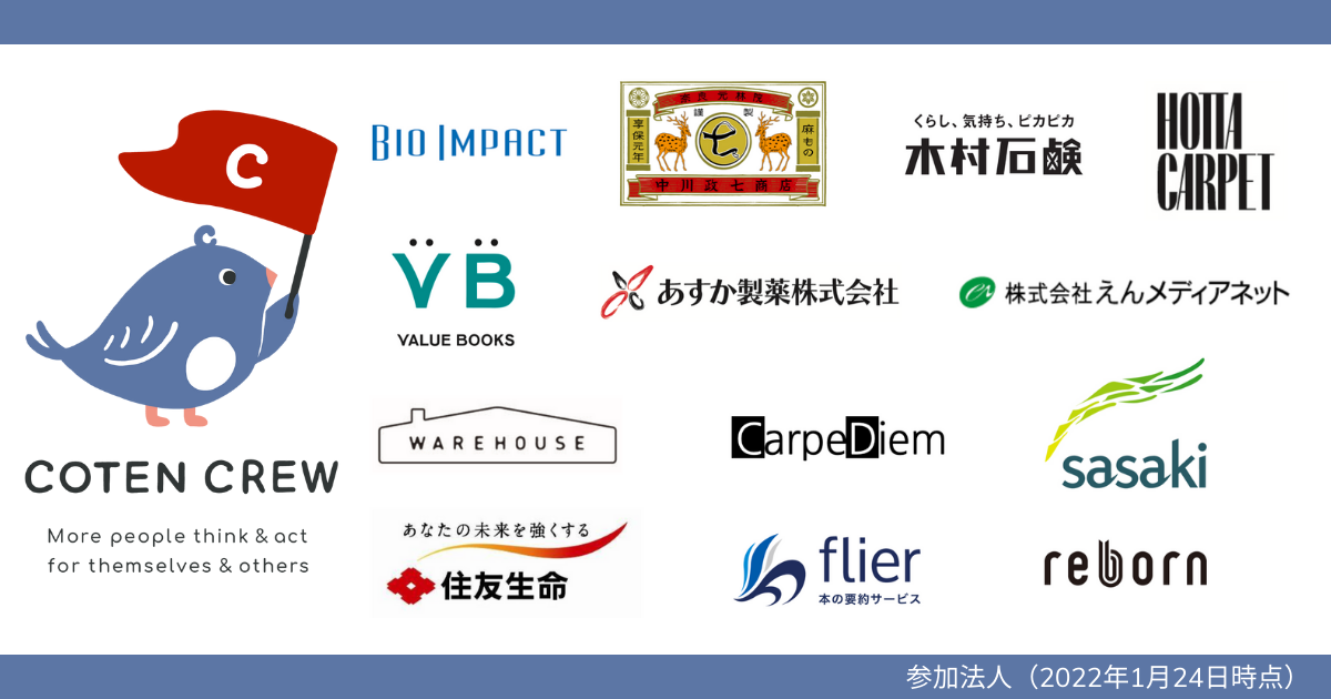 COTENは、COTENが掲げるVision・Missionや世界史データベース事業に共感し、賛同してくださる法人を対象に、COTENを月額50,000円(税抜)から支援する法人COTEN CREWの募集を1月24日より開始いたします。法人の皆様もCOTENと同じVisionを描き共に未来へ進む仲間と考えており、法人COTEN CREWからいただく支援には、直接的な見返りではなく世界史のデータベース開発を始めとする事業の推進を通して、社会へ還元していく所存です。既に13社が趣旨に賛同し加入いただいております。
