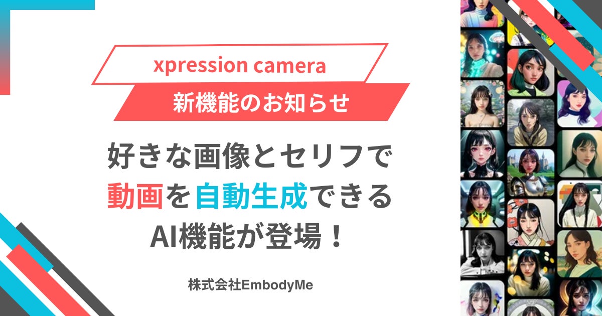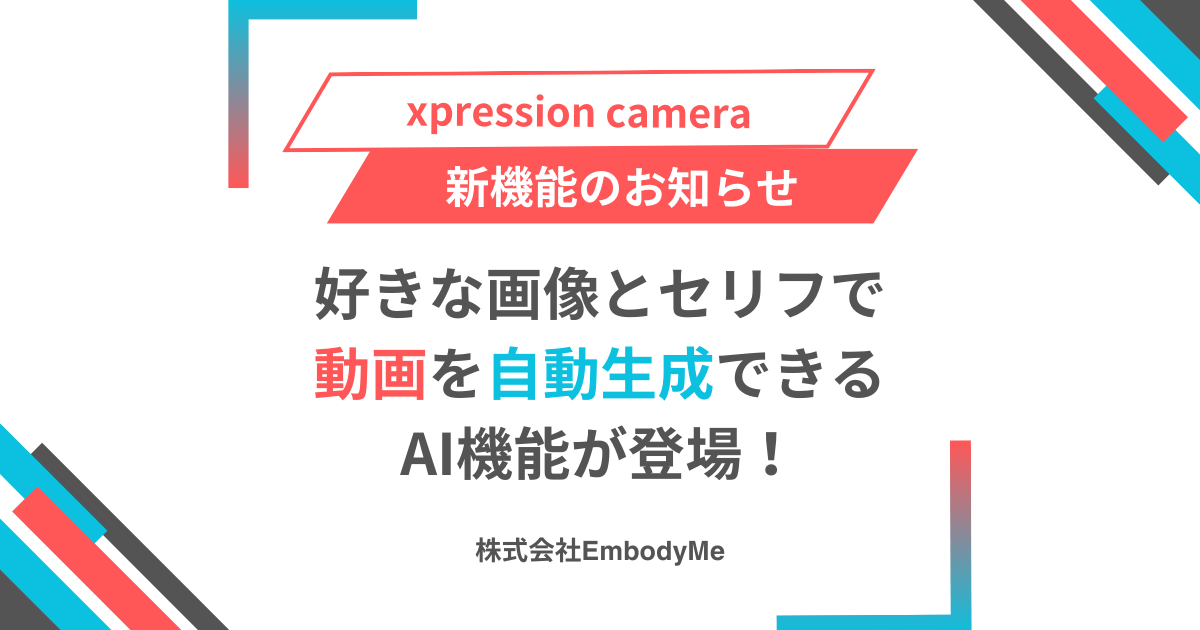 株式会社EmbodyMe(エンボディーミー、以下EmbodyMe)は、オンライン会議やストリーミング配信で自分の外見をAIで置き換える「xpression camera(エクスプレッションカメラ)」に、新たな動画生成機能を追加しました。