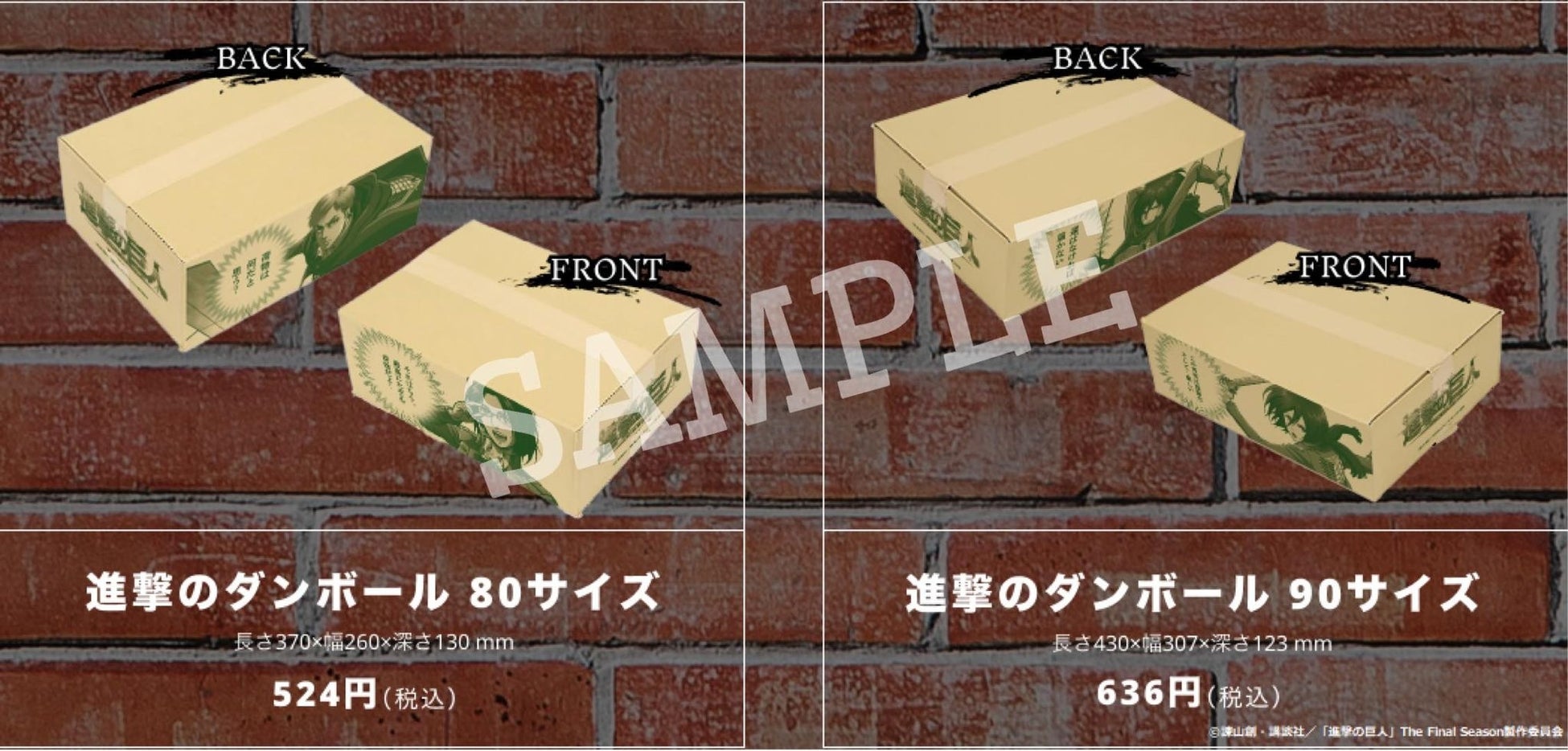 巨人や調査兵団を豪華にあしらった計6種のダンボールが、贈り物に+αのサプライズを演出します。