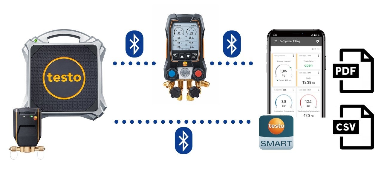 - 対応モデル: モバイルアプリ testo Smart (Android / iOS)、デジタルマニホールド testo 557s / 550s、旧デジタルマニホールド testo 557 / 550 (Bluetooth搭載モデル)