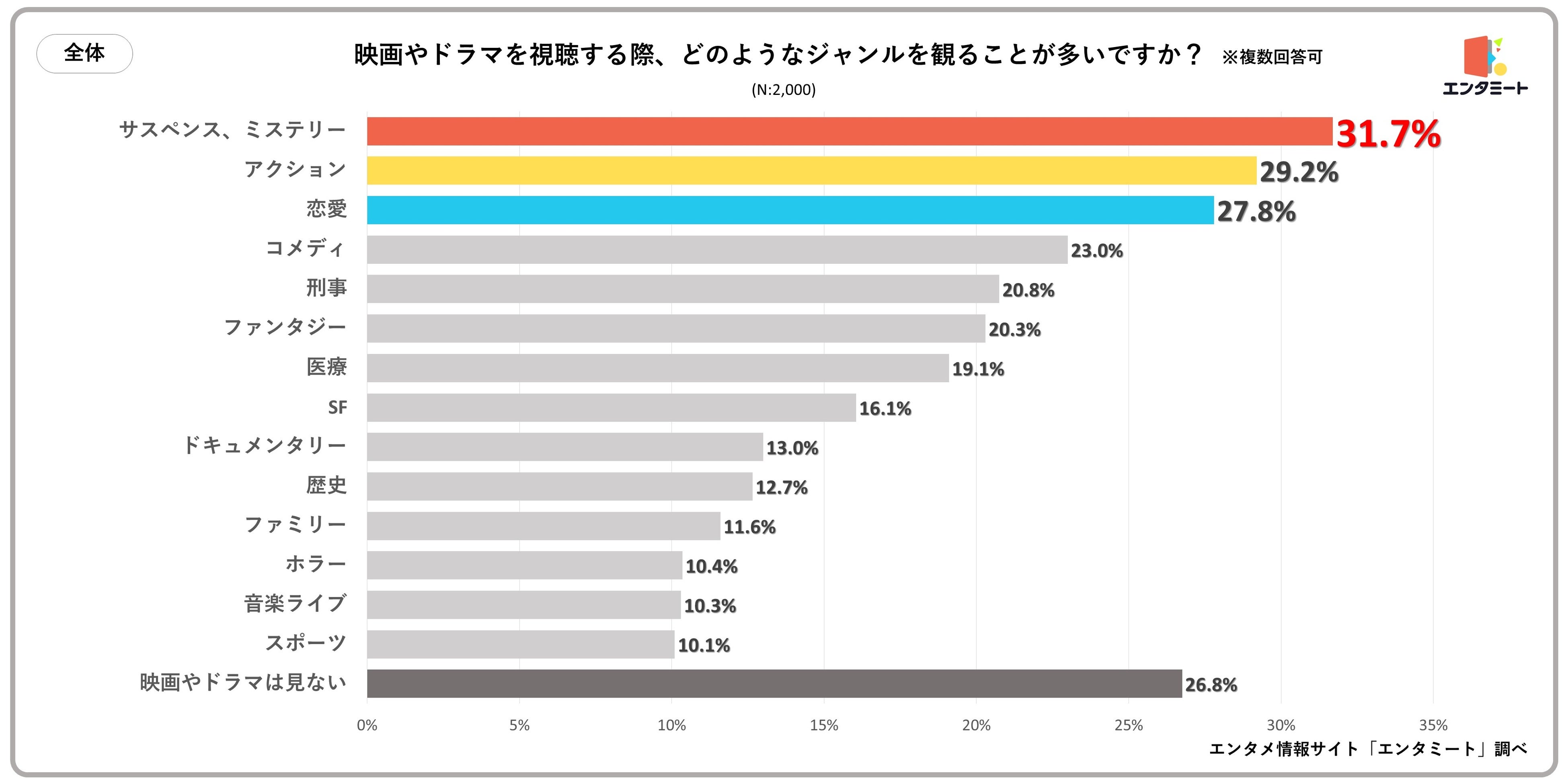 全国の10代~50代の2,000人の男女を対象に「映画やドラマを視聴する際、どのようなジャンルを観ることが多いですか?」というアンケートを行ったところ、最も多かった回答は「サスペンス、ミステリー」で31.7%でした。次いで、「アクション」が29.2%、「恋愛」が27.8%と続く結果になりました。その一方で、「映画やドラマは見ない」との回答も26.8%にのぼり、そもそも映画・ドラマを見ないという層が一定数いることが分かりました。