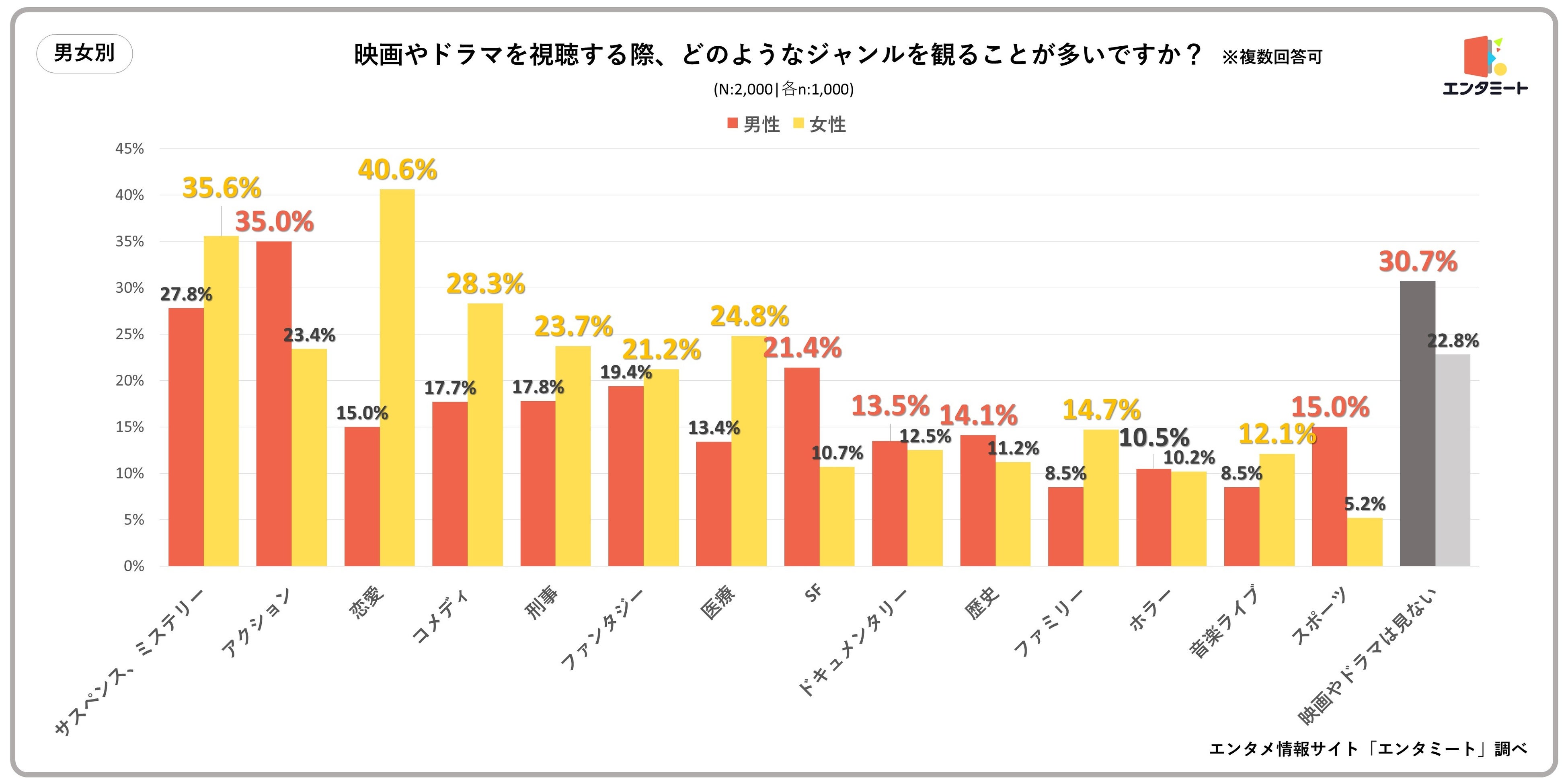 男女別で見ると、いずれかのジャンルを選択したのは女性が男性を上回っており、映画やドラマを視聴しないのは男性の方が多いという結果でした。最も差が大きかったのは「恋愛」で、男性が15.0%に対して女性は40.6%と、2.5倍以上もの大きな差がついています。それ以外にも、「サスペンス、ミステリー」、「コメディ」、「刑事」、「ファンタジー」、「医療」といった定番のジャンルで女性の回答が多くなりました。しかし、人気上位のジャンルの中では唯一「アクション」のみが男性の回答が多いという結果でした。