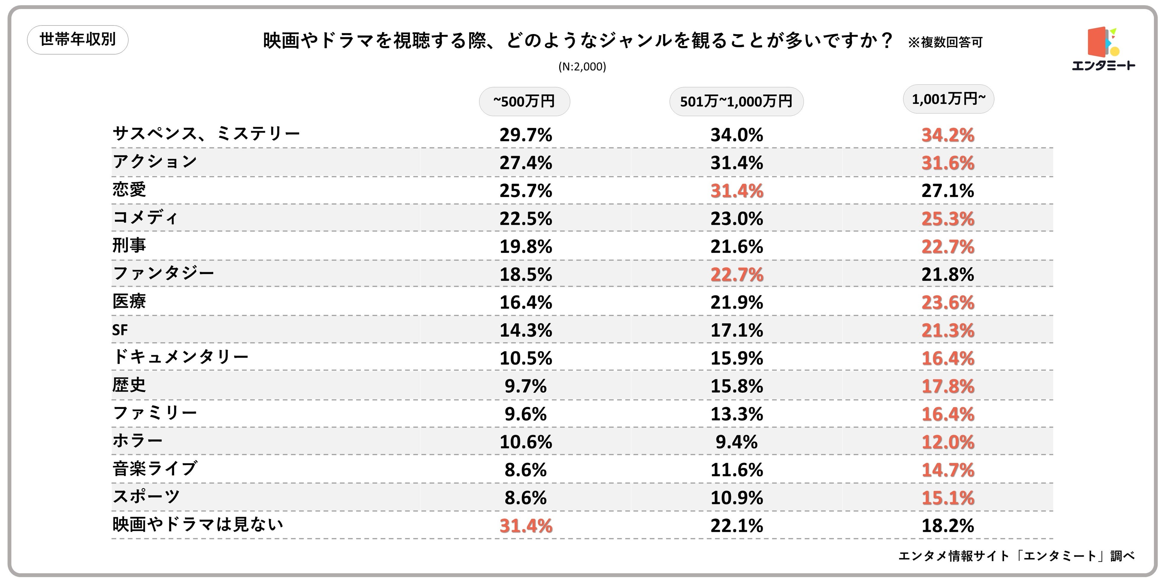 世帯年収別で見ると、「~500万円」では「映画やドラマは見ない」と回答した方が31.4%で最も多かったのに対して、「501万円~1,000万円」で22.1%、「1,001万円~」では18.2%となっており、収入が上がるにつれて映画・ドラマを視聴している人が多くなっていることが分かります。このことから、世帯年収が高くなるほど趣味・娯楽に割ける時間が多くなるという傾向が伺えます。ただ、ジャンルごとの数字に大きな差はなく、収入と映画・ドラマのジャンルの好みに相関関係はないと考えられます。