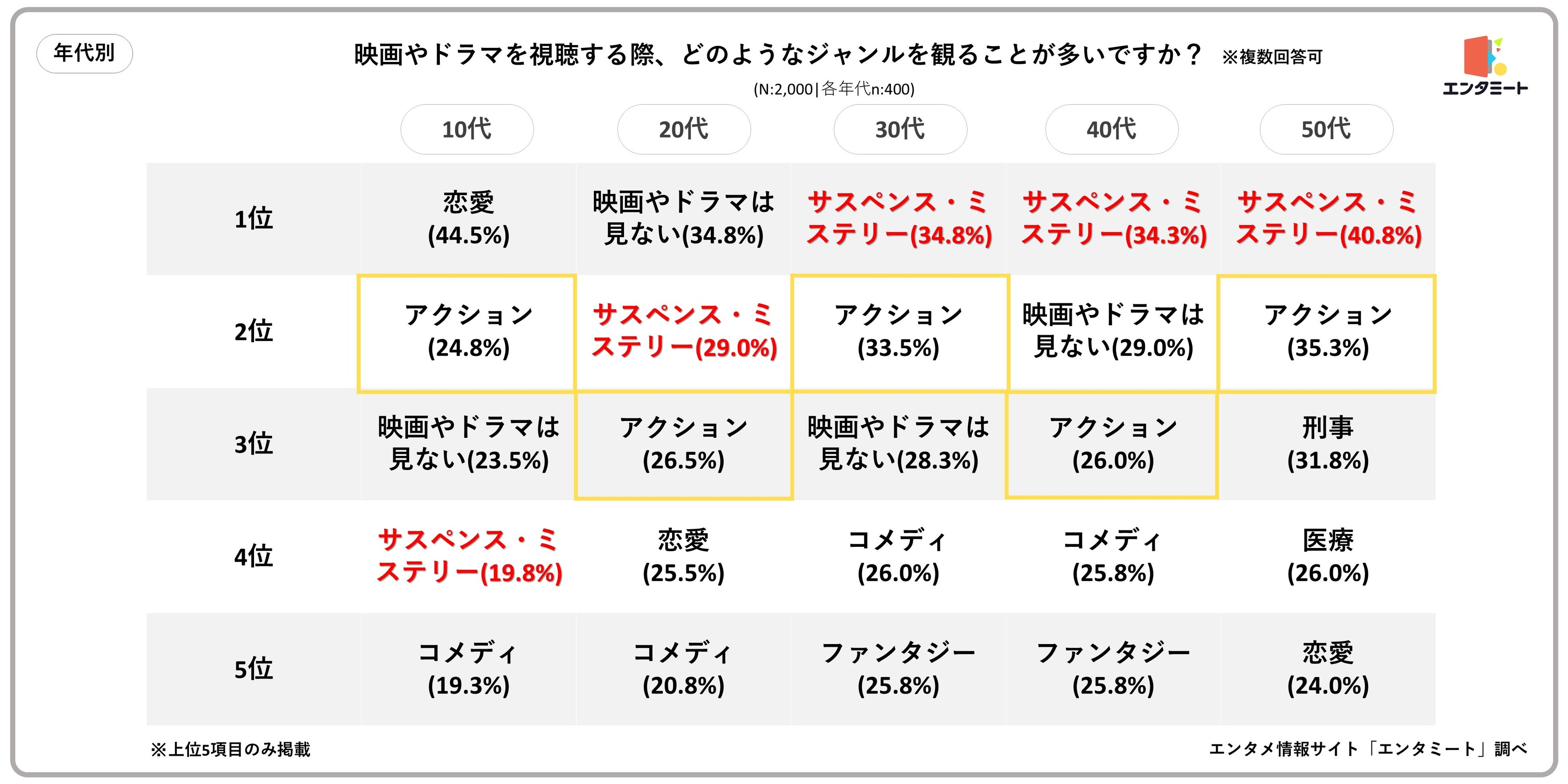 株式会社ドリーム・トレイン・インターネット(本社:東京都渋谷区、代表取締役社長:清水高、以下「DTI」)が運営する「毎日を楽しくする作品に出会える」をコンセプトにアニメ、映画、ドラマの作品情報や動画配信サービスなどの情報を配信している「エンタミート」は、全国の10代~50代の男女2,000人を対象に視聴する映画やドラマのジャンルに関するアンケートを実施し、年代別等の特徴についてまとめました。