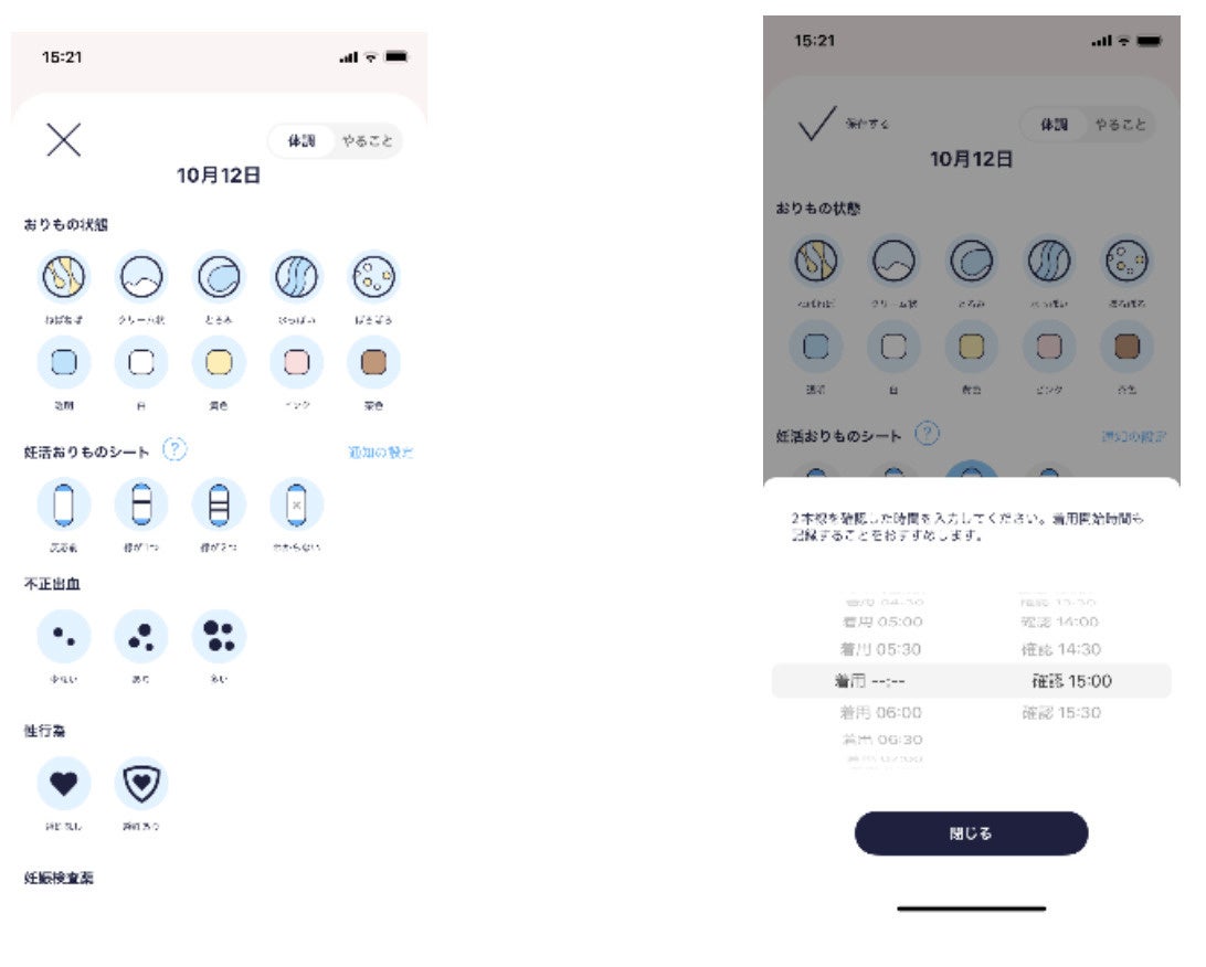 ③『ソフィ 妊活タイミング※3をチェックできるおりものシート』の使用状況や、毎日の体調を細かく記録することが可能です。