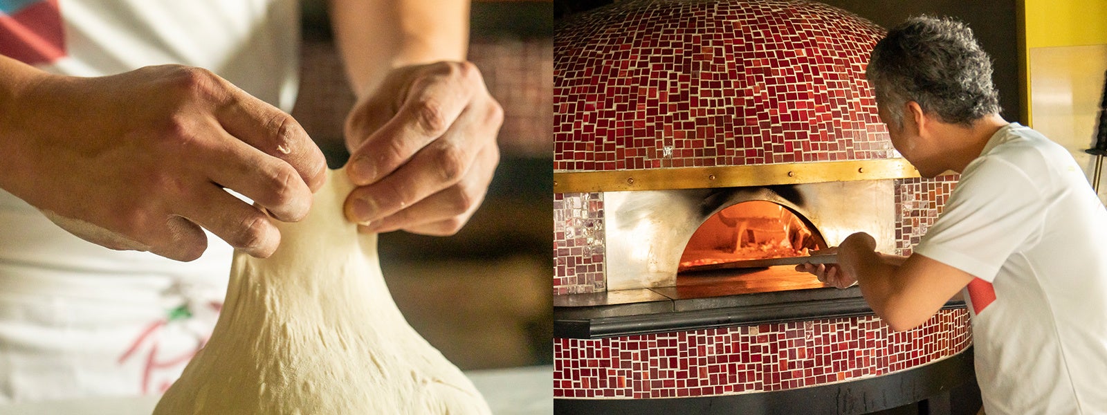 ナポリピッツァの命ともいえる生地は小麦粉・水・塩・酵母のみを仕様したナポリの伝統製法で作り上げます。冷凍で本格的なナポリピッツァを実現するために、試行錯誤を重ねたどり着いた独自ブレンドの小麦粉を練り上げ、1枚1枚手で伸ばし、450度の高温で一気に焼き上げ、独自の冷凍技術で、解凍不要トースターに入れるだけで、最高の状態の生地を実現しました。