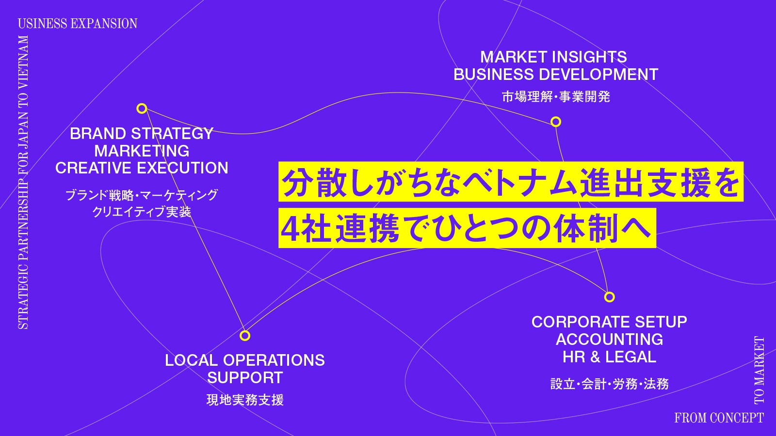 本提携では、日本市場の日系企業を対象として、ベトナム進出に関わる戦略立案、現地調査、設立準備、実務支援、進出後の事業立ち上げ支援を各社が連携して提供するとともに、進出前後のブランド戦略、ブランディングおよびマーケティング支援を行い、企業の円滑かつ実効性のあるベトナム進出を支援します。