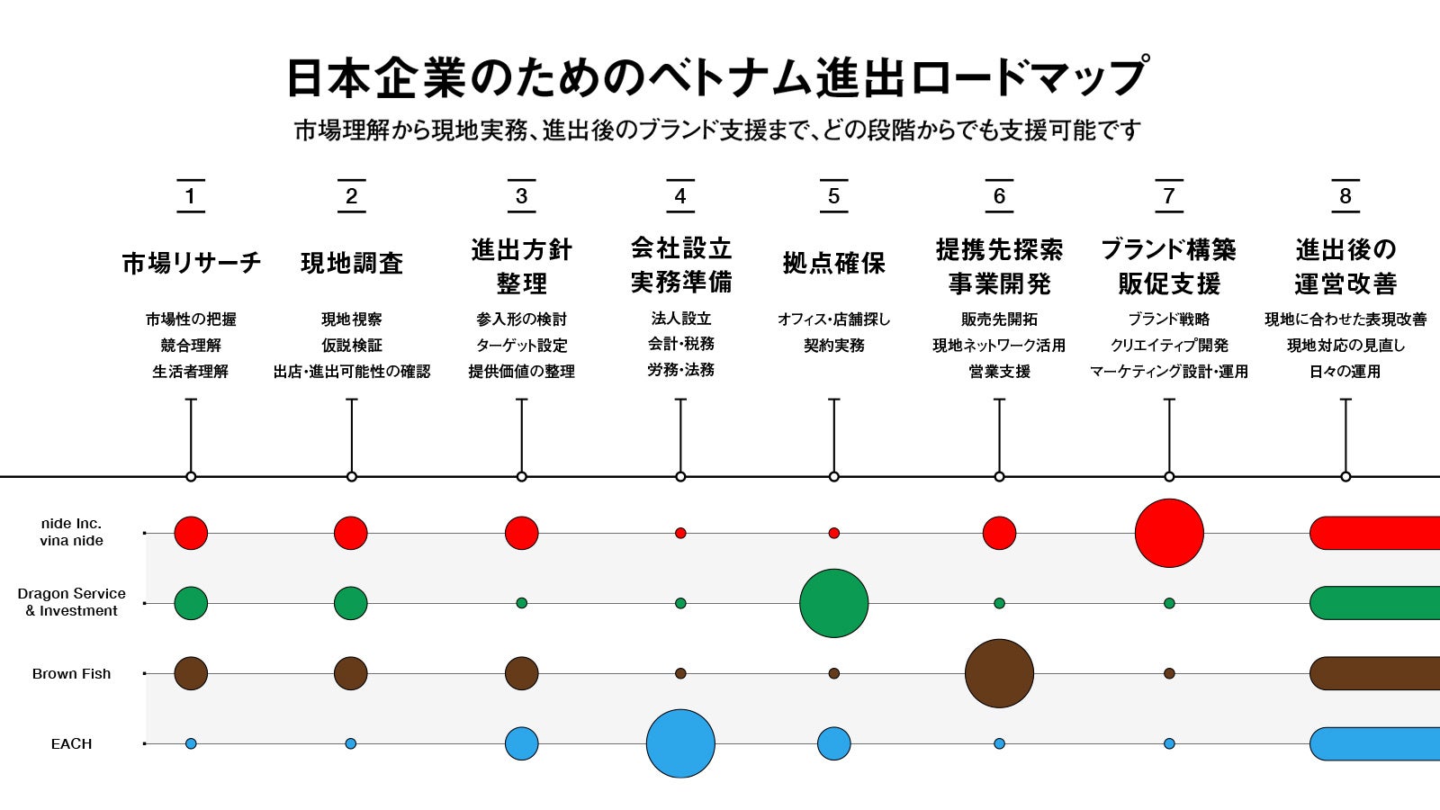 ベトナム市場において競争相手となるのは、日系企業に限りません。ベトナムのローカル企業、そして各国から進出している企業と向き合いながら、自社の価値をどう位置づけるかが問われます。そのためには、進出支援もまた、設立や拠点準備だけでなく、市場理解、事業開発、ブランド戦略、マーケティングまでを一体で考える必要があります。