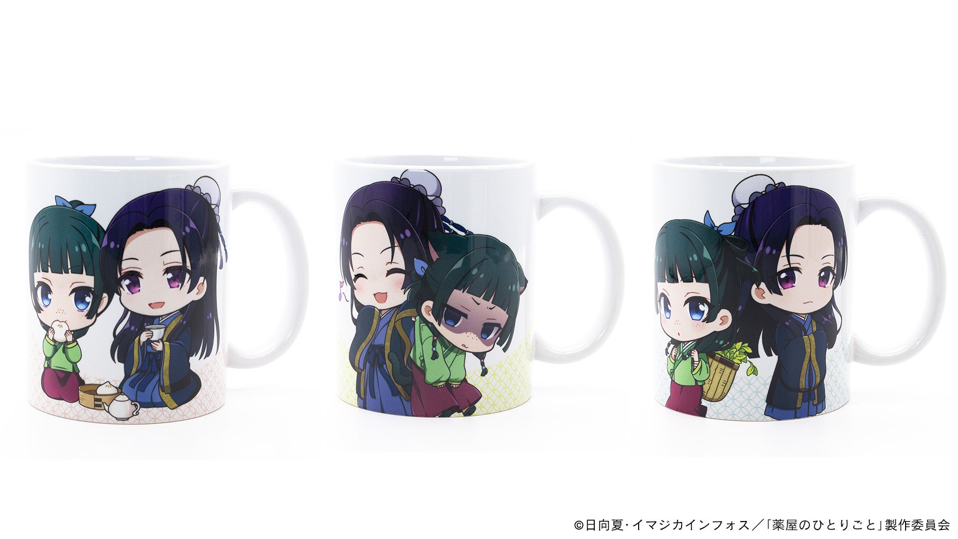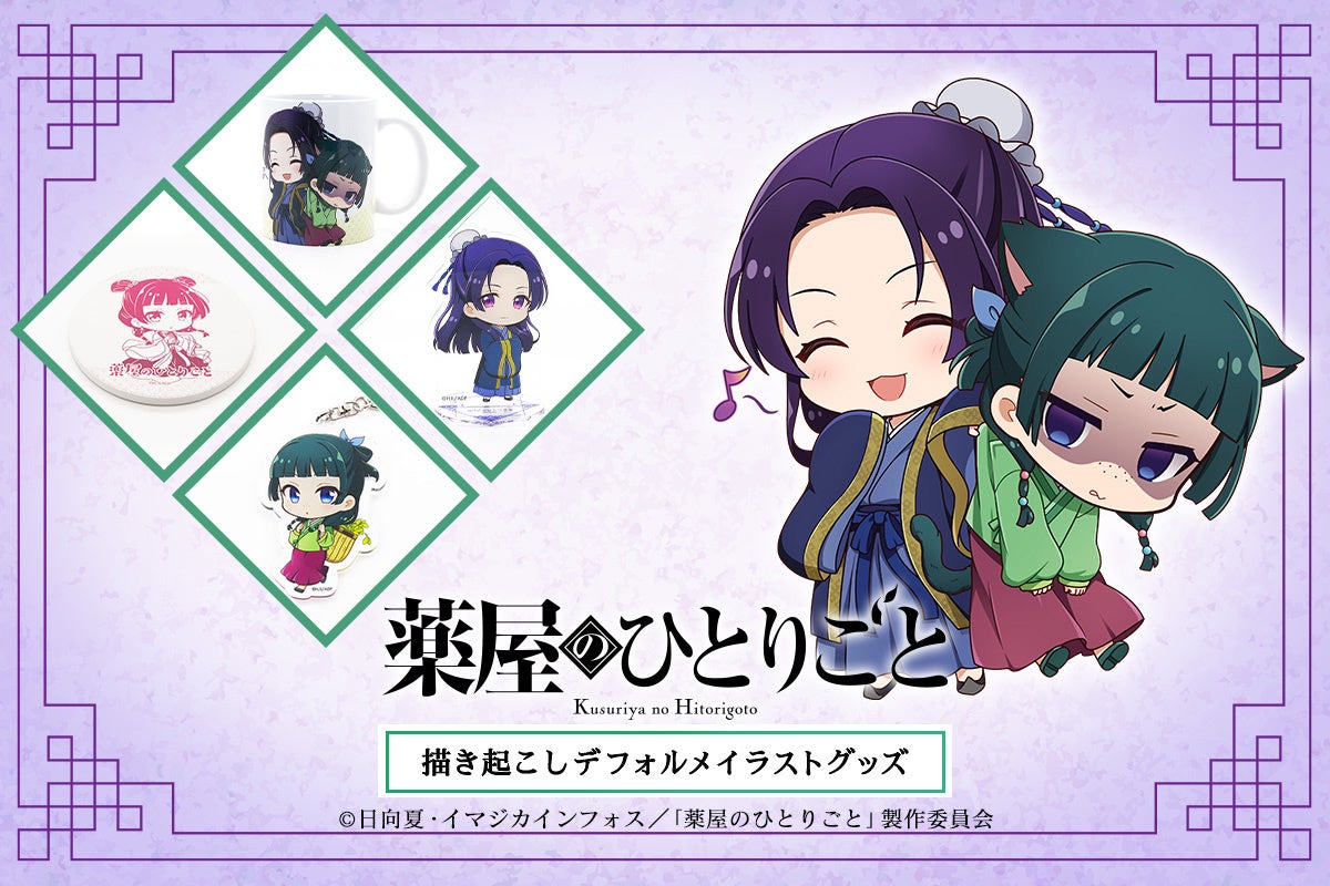 キャラクター雑貨は、今回のために描き起こした猫猫と壬氏の「ちびキャライラスト」を使用し、キーホルダーやマグカップ、コースターなど日常使いで楽しめるラインナップとなっております。ちびキャラのイラストは大好評で、TVアニメ『薬屋のひとりごと』のファンだけでなく、可愛いグッズを身につけたい・お部屋に飾りたいなど様々な方に楽しんでいただける商品です。