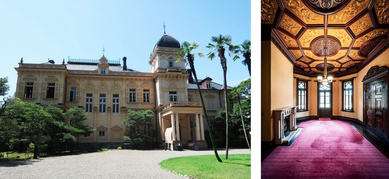 館内の随所に見事なジャコビアン様式の装飾が施されていて、同時期に多く建てられた西洋建築にはない繊細なデザインが、往事のままの雰囲気を漂わせています。別棟として建つコンドル設計の撞球室(ビリヤード場)は当時の日本では非常に珍しいスイスの山小屋風の木造建築で、洋館から地下道でつながっています。洋館と結合された書院造りの和館は当時の名棟梁大河喜十郎の手によるものと言われています。床の間や襖には、明治を代表する日本画家・橋本雅邦が下絵を描いたと伝えられる障壁画などが残っています。
