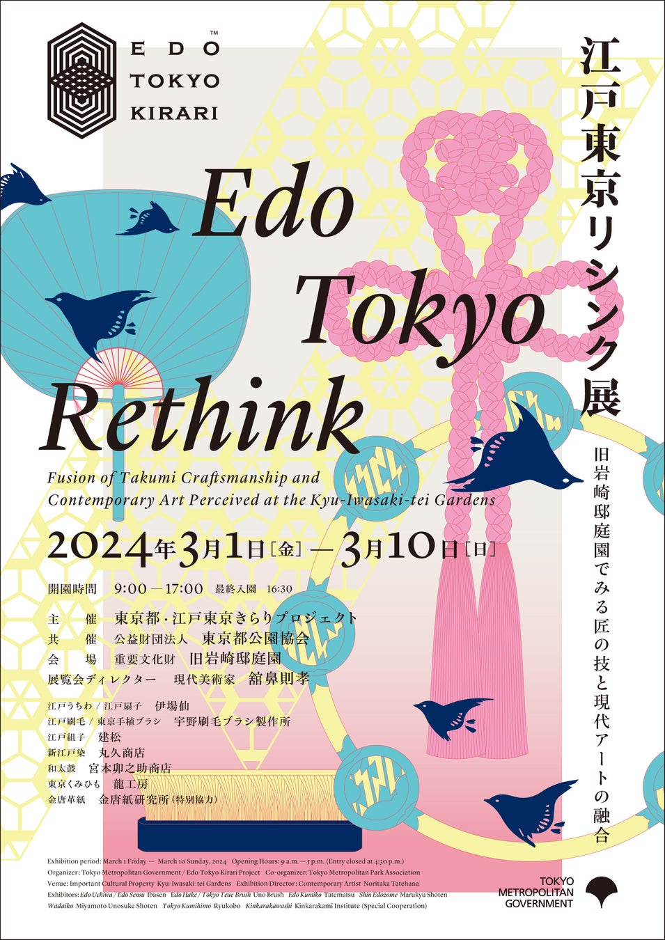 江戸東京の伝統に根差した技術や産品などを新しい視点から 磨き上げ、世界へと発信していく「江戸東京きらりプロジェクト」は、現代アートの分野で国内外問わず幅広く活躍する舘鼻則孝を展覧会ディレクターとして招聘し、展覧会「江戸東京リシンク展 -旧岩崎邸庭園でみる匠の技と現代アートの融合-」を実施します。本展覧会は 2021 年より毎年継続して開催。東京都の伝統産業事業者を舘鼻則孝のコラボレー ターとして迎え、「 日本文化の過去を見直し現代に表現する」という舘鼻則孝の創出プロセスである「Rethink(リシンク)」を起点として、歴史ある伝統産業の価値や魅力を新たなかたちで提案しています。本年は、新たに制作されたアート作品や伝統産業事業者が保有する貴重な歴史的資料を、国の重要文化財である旧岩崎邸庭園にて、2024 年 3 月 1 日(金)9 時より開催いたします。展覧会開催以来、最長の会期でお届けいたしますので、ぜひ作品を間近にお楽しみください。