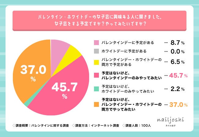 次に「バレンタイン・ホワイトデーの女子会に興味ある人に聞きました。女子会をする予定ですか?やってみたいですか?」と質問したところ、「予定はないけれど、バレンタインデーのみやってみたい」と答えた人が45.7%と最も多く、バレンタインデーでの女子会に対して、最も高い関心が寄せられていることがわかりました。