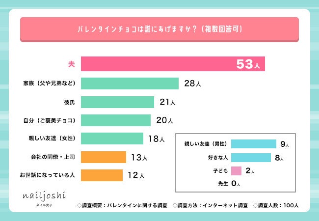 ・バレンタインチョコの贈り先では「夫」が53人で最多。「家族」28人、「彼氏」21人と続き「自分へのご褒美」も20人と一定数存在。