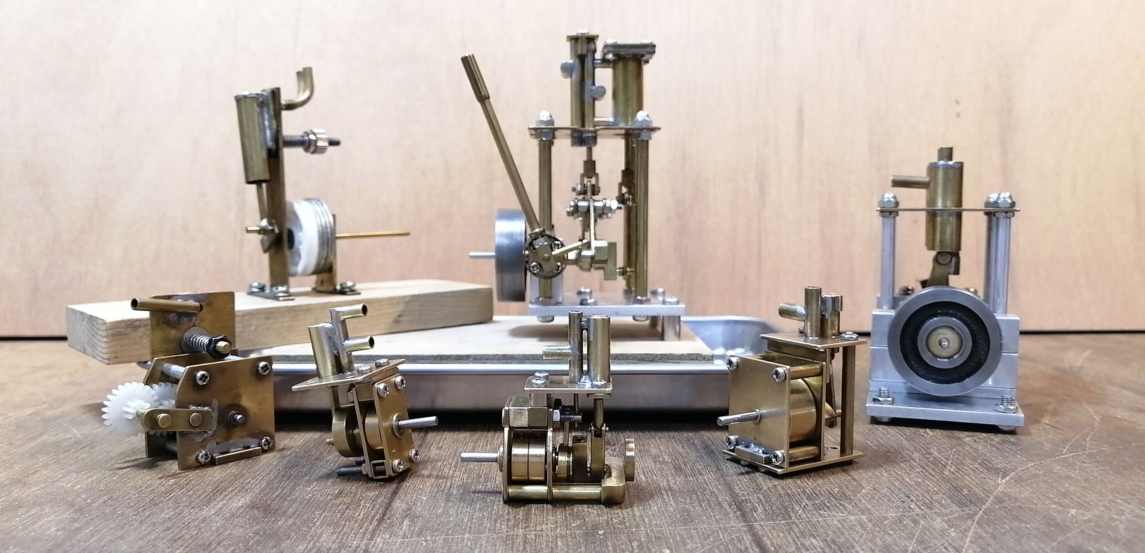 小型のボイラーを接続蒸気圧しで動作する、手のひらサイズの蒸気機関。真鍮やアルミを糸鋸やボール盤などで加工(旋盤を使用しない)し、それをハンダ付けして製作したものです。首振り式、ピストンバルブ式、逆転機付きなど、さまざまなタイプの蒸気機関約10機を圧縮空気で動かして展示します。井戸のポンプの模型も展示予定です。カチャカチャ、シュポシュポと動く、古くて新しい機械たちをぜひご覧ください。