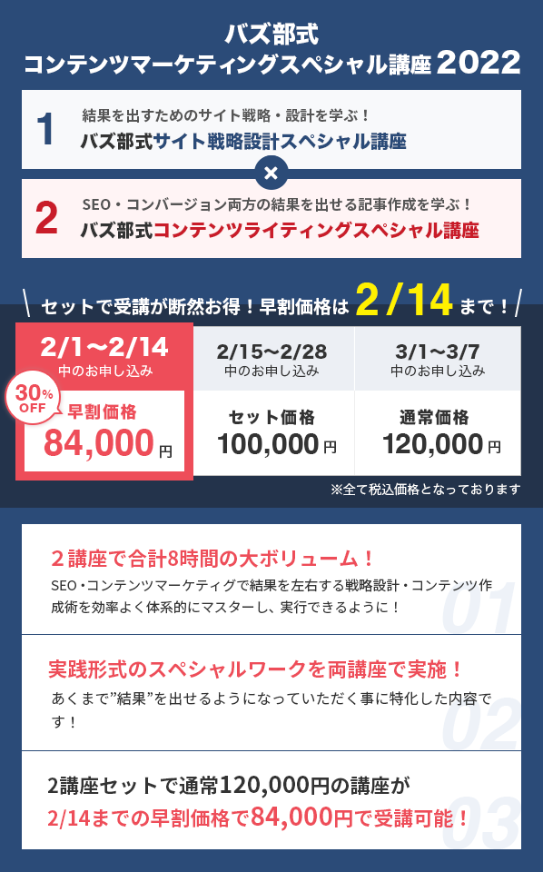 弊社運営メディアバズ部(https://bazubu.com/)は今年の5月で生誕から丸10年を迎えます。この10年でSEO、コンテンツマーケティングを取り巻く環境は大きく変わってきました。SEO、コンテンツマーケティングの移り変わりと共に、バズ部では10年で沢山の企業様とコンテンツマーケティングに取り組み、バズ部には膨大な数のデータや知見が蓄積してきました。この10年という節目の年に、バズ部を普段支持していただいている皆様に感謝の意味をこめて還元できればと思い、10年で初めての「2日間・全8時間」にわたる大ボリュームのセミナーを実施いたします。