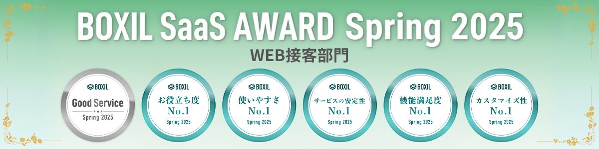 同日に発表された「BOXIL SaaS AWARD Spring 2025」で、WEB接客部門の「「Good Service」「使いやすさNo.1」「機能満足度No.1」等、6カテゴリ」にも併せて選出