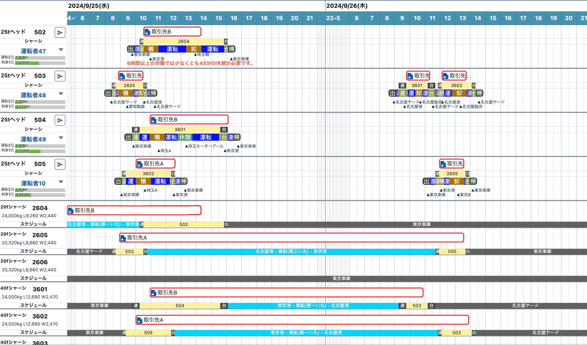 コンテナ、シャーシ、RORO船を組み合わせた受注データ作成および運行計画を作成することができます。ドライバーの拘束時間や残業時間、運転時間等の改善基準告示対応を支援します。