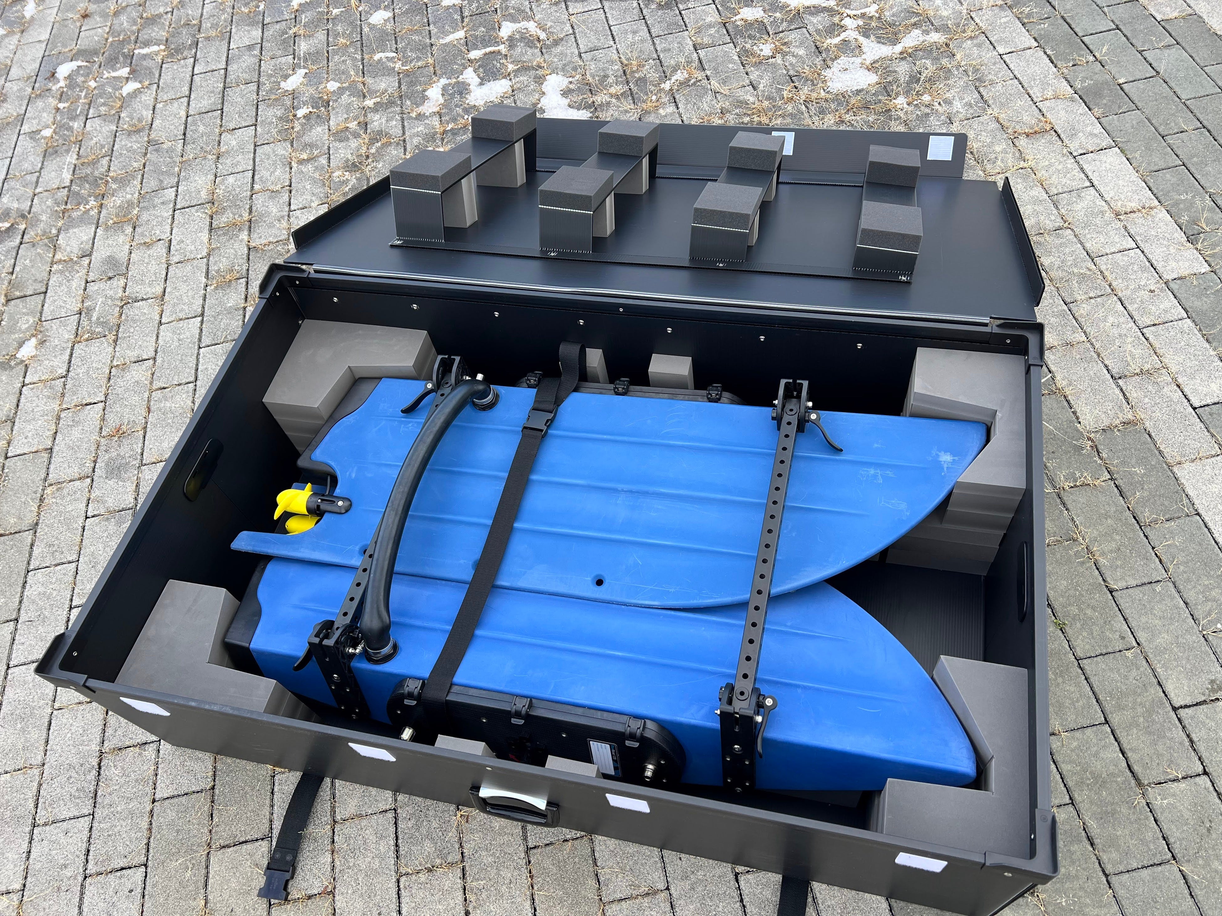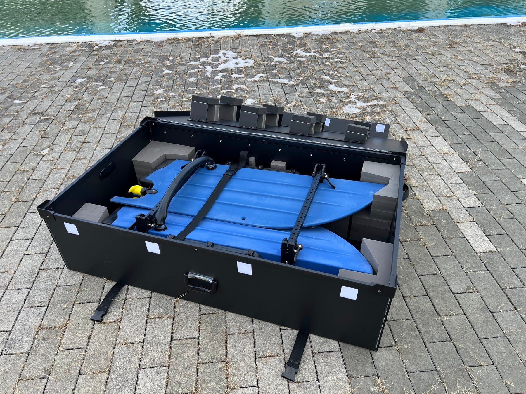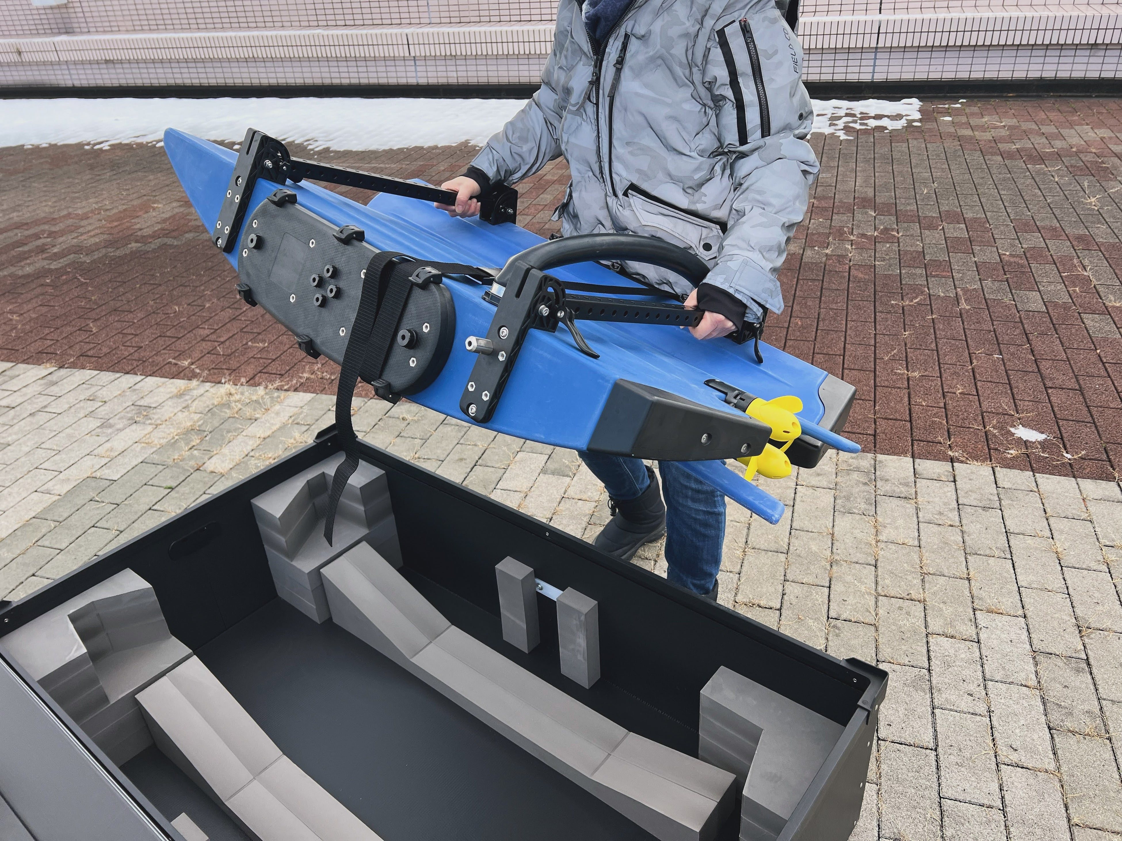 専用ケースについての説明をシンプルにすると、この専用ケースはBlueBoatの運搬を格段に便利にします。BlueBoatを折りたたんでピッタリ収めることができ、専用の緩衝材で保護されているため、安全に携帯できます。通常の箱や段ボールでは不便な大きさの機体も、このケースなら問題なく持ち運べます。