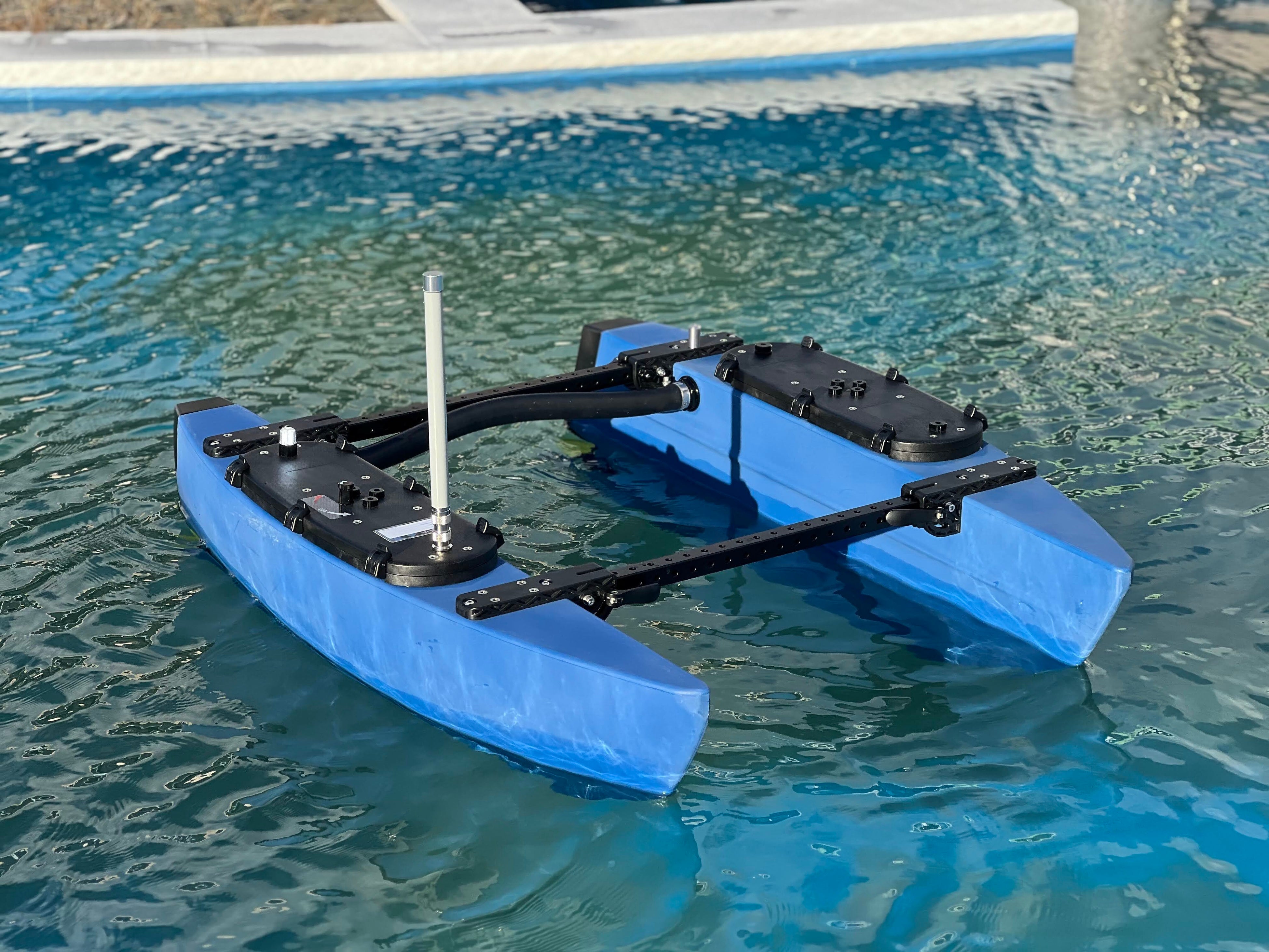 これまでいくつかのボート開発や自作ボートを運用してきました。これまでBlueROV2に搭載されているスラスターを代用していたのですが、水面にある水草やゴミが絡まり運航ができなくなる現象がありました。「BlueBoat」はウィードレスプロペラを使うことでそれらが改善されています。