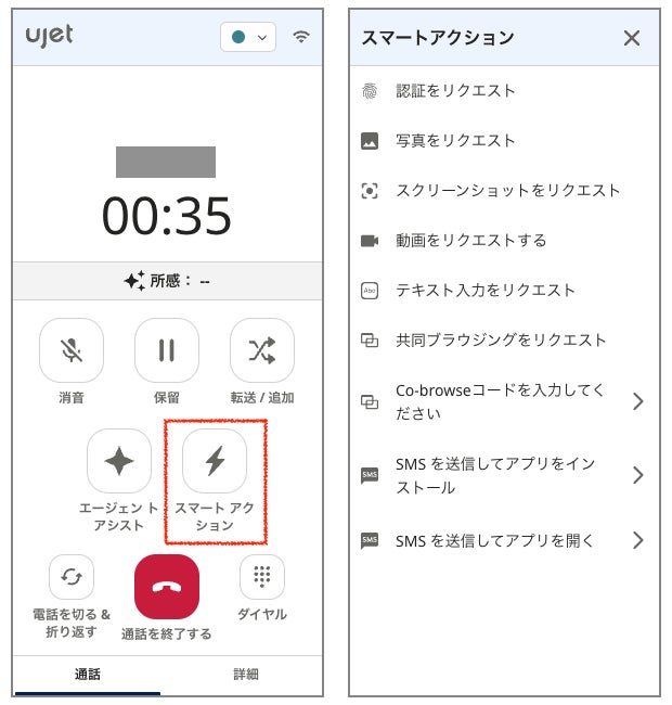 例えば、オペレーターは通話したままの状態で、UJETが特許を取得している「スマートアクション」ボタンからワンクリックで顧客側に生体認証を求めたり、静止画・動画の撮影を依頼したり、位置情報・OS情報の取得をすることが可能です。
