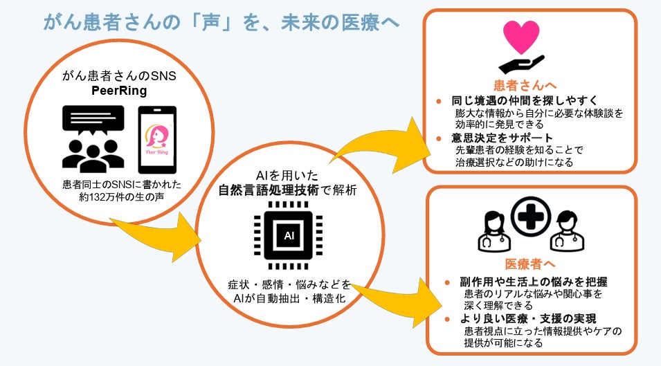 当社は、がん患者向けコミュニティ型SNS「Peer Ringピアリング」の運営を通じて蓄積された患者の声を研究基盤として提供し、学術的に信頼性のある解析を支える役割を担います。患者体験を科学的に整理・分析することで、医療現場や社会に還元可能な知見を創出し、ピアサポート活動を行う一般社団法人ピアリングとともに、がん患者支援の新たな可能性を拓きます。