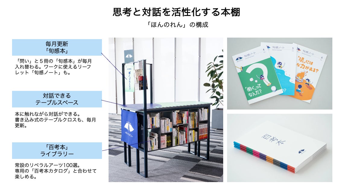 リモートワークやオンラインミーティングが常態化した今こそ、偶然の出会いや、目的に縛られない対話の重要性が見直されています。学校やオフィスでは、人が集まることで生まれる共創や創発の力を活性化する場づくりが問われるようにもなりました。日常会話の枠を超えて、よりよく相手を知り、新しい価値を生み出すような交わし合いを促すために、「ほんのれん」という本の空間を設置することを提案しています。