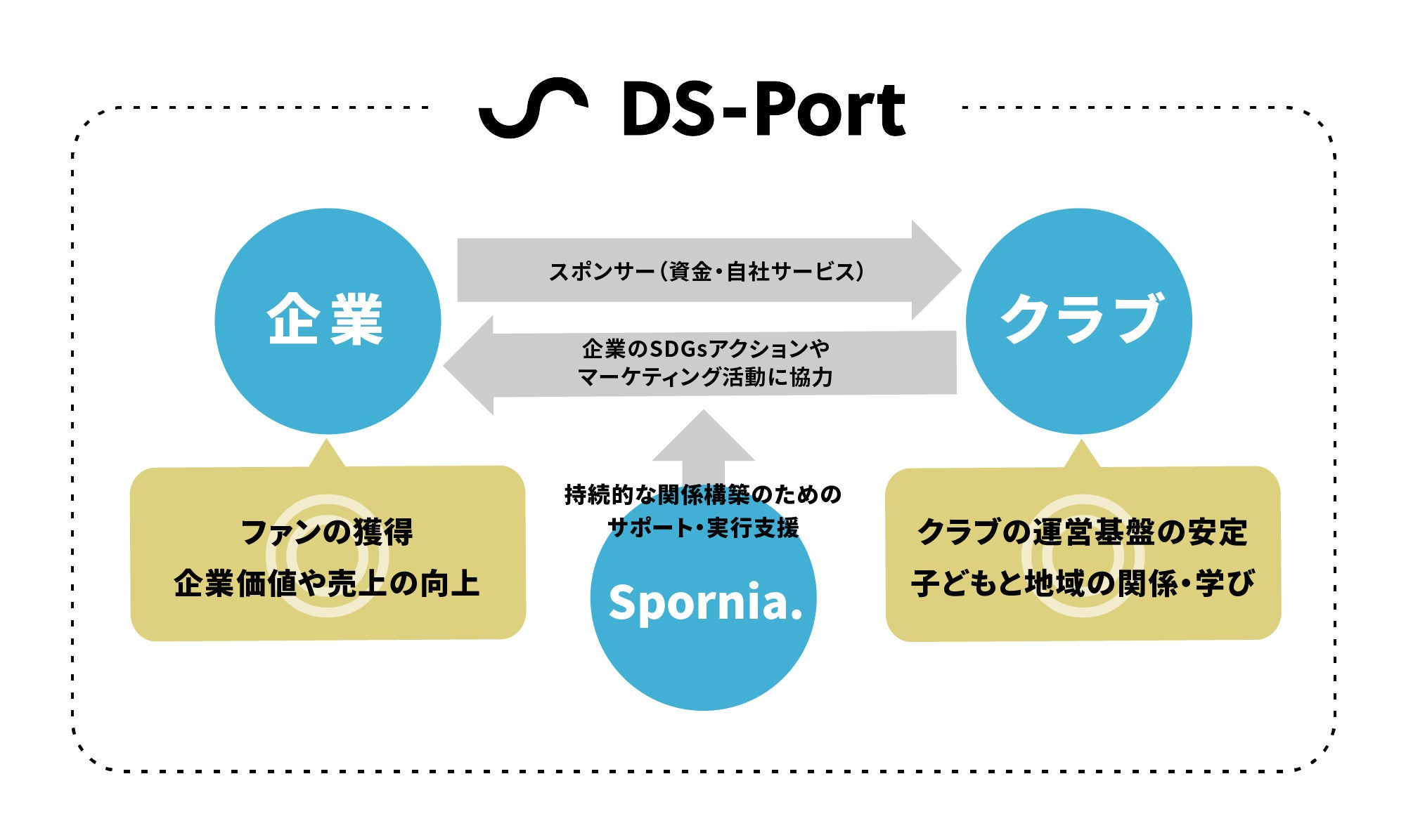 そこで、そうした運営課題を抱える《ローカルスポーツクラブ》と、地域と連携した事業展開や、地域貢献・社会貢献に繋がるアクションを望む《企業》をスポンサーマッチングさせ、双方の経営課題を解決しながら、地域の子どもたちのスポーツ環境を守るための新事業「DS-Port」がスタートしました。