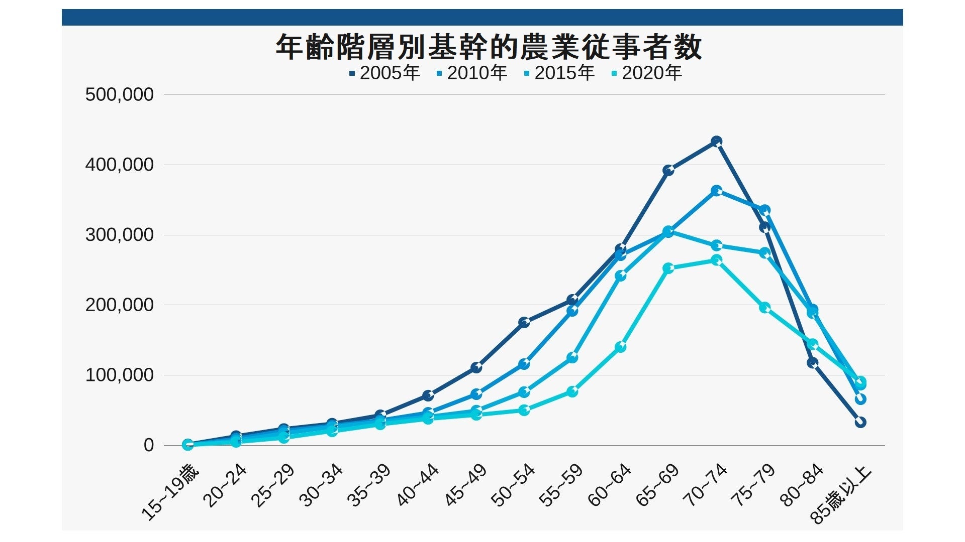 基幹的農業従事者の推移 資料:農林水産省「農林業センサス」データよりグラフ作成 注:1) 各年2月1日時点の数値 2) 平成17(2005)年の基幹的農業従事者数は販売農家の数値