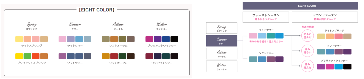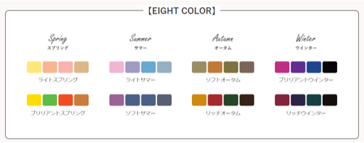 EIGHT COLORの中から一番目に似合う色のグループ(ファーストシーズン)を決めたあと、色相・明度・彩度・清濁の観点から2番目に似合う色のグループ(セカンドシーズン)もわかるため、得意な色はもちろんのこと苦手な色の傾向も理論的に理解でき、その方の似合う色をよりわかりやすく的確にご提案できるようになります。