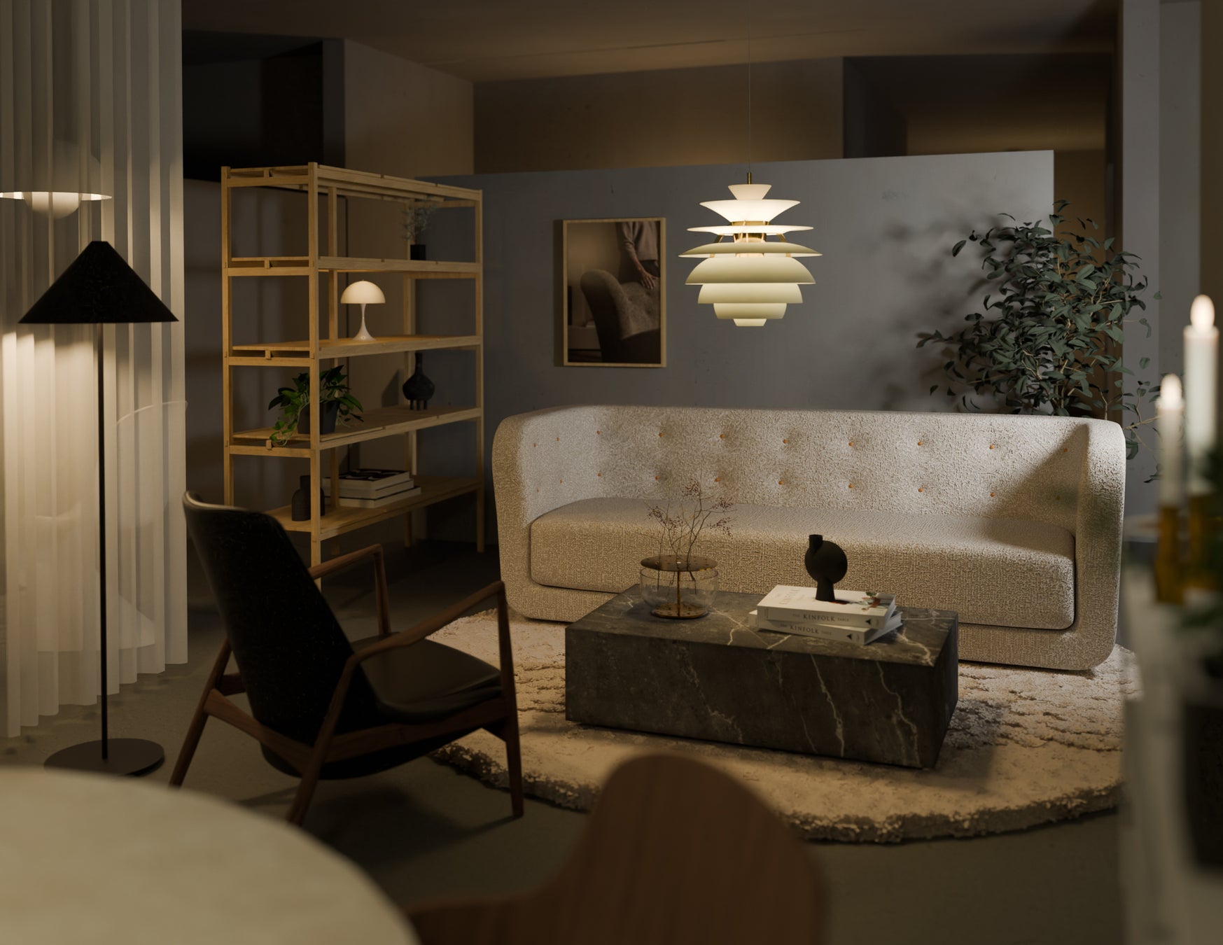 北欧の名作照明と家具を組み合わせ、リビングやダイニング、寝室など複数のシーンを再現します。