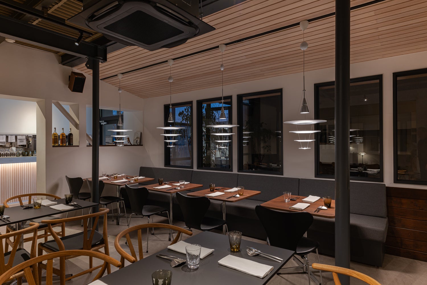 店内は、ルイスポールセンをはじめ、ティンバーヤードが正規代理店を務めるブランドの照明をしつらえ、夜の時間だからこそ味わえる、やわらかく心地よい光のなかでお食事をお愉しみいただけます。
