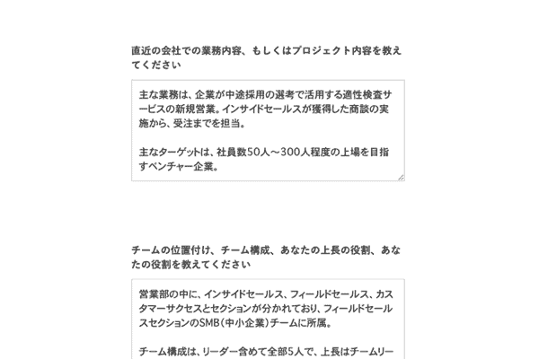 - 候補者ごとに職務経歴書のフォーマットがバラバラで分析ができない。大きな労力をかけて書いたことは伝わるが、「知りたいのはそこじゃない」といったものも多い