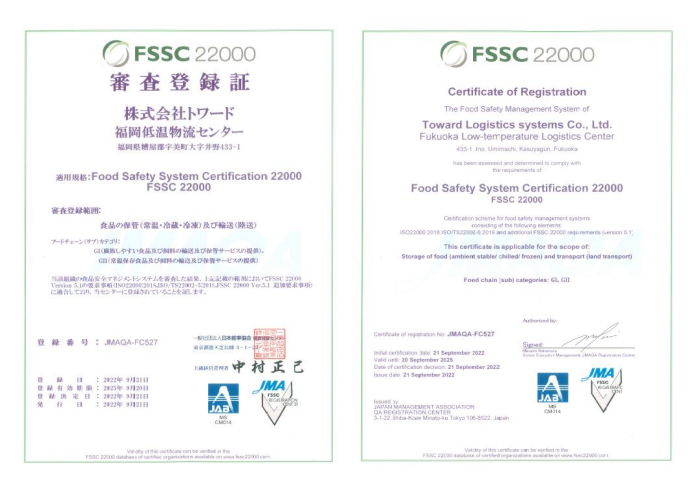 株式会社トワード(本社:佐賀県神埼郡吉野ヶ里町、代表取締役社長:友田健治)は、福岡低温物流センター(福岡県糟屋郡宇美町)において、食品安全マネジメントシステムの国際認証規格である「FSSC22000」の物流カテゴリー(G1:冷蔵・冷凍、G2:常温)での認証を取得しましたので、お知らせいたします。