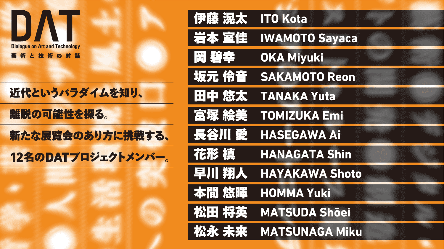 メディアアートやデジタルアート等のアート&テクノロジー分野の専門家育成を目的としたプロジェクト「藝術と技術の対話(DAT)」では、2026年5月より札幌およびニューヨークで展覧会をつくり出す新たな教育プログラムを開始します。今般、本プログラムに参加するプロジェクトメンバーを公募し、選考の結果、95名の応募の中から12名を採択しました。