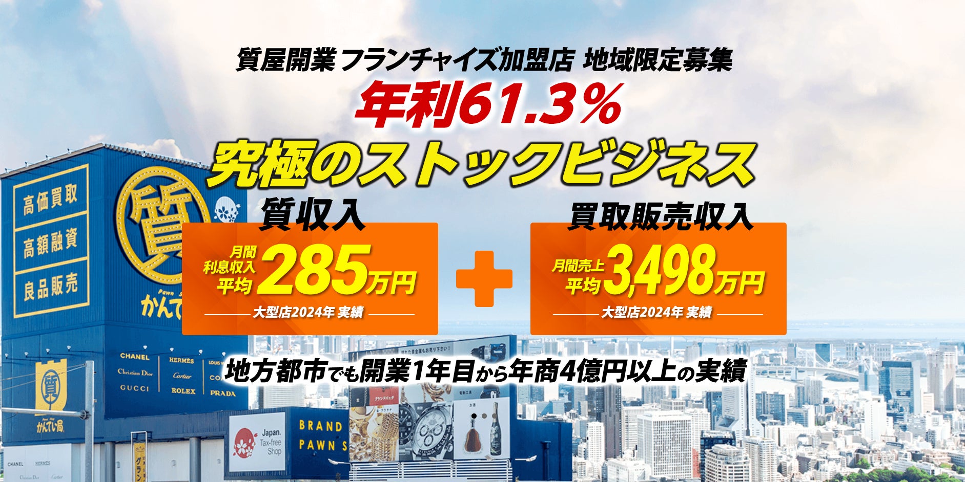 全国にグループをもつ安心の質屋!『質屋かんてい局』は、質・買取特化型から大型店まで複数の出店パターンで運営ができるビジネスです。どの出店店舗であっても店舗運営支援や人材採用支援、研修制度など、本部のサポート制度が手厚いため安心して事業に挑戦できます。