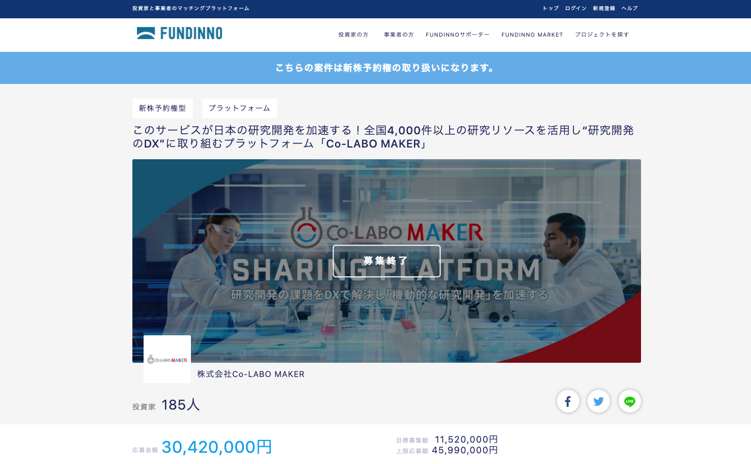 株式会社Co-LABO MAKER(本社:宮城県仙台市 代表取締役社長:古谷優貴 以下、当社)は、この度、株式投資型クラウドファンディングサービス「FUNDINNO(ファンディーノ)」を利用した募集を行い、募集開始4時間38分で目標募集額11,520,000円に到達し、募集期間終了後には3,042万円(目標募集額の264% 185名の投資家様が応募)の応募額を達成したことをお知らせします。