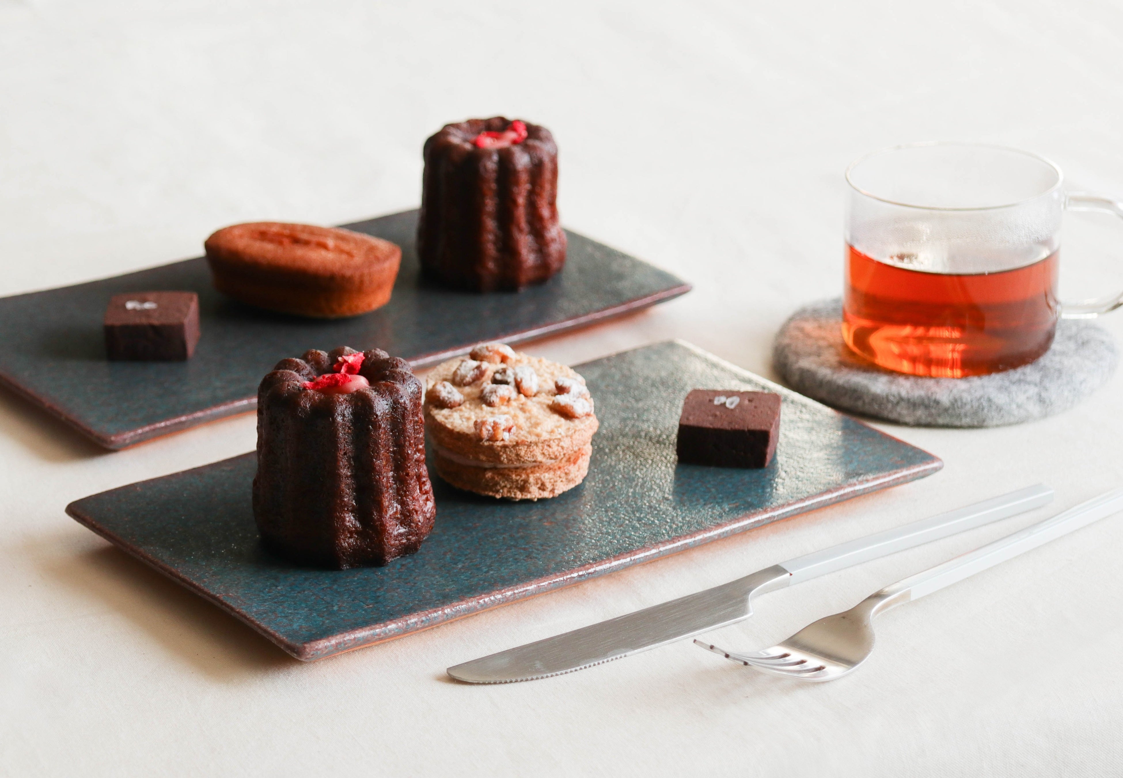 シンプルなフラットプレートには、TOKINOHAの持ち味がふんだんに散りばめられたシリーズ 「copper」 (ブルー) と同じ釉薬を使用。 銅の発色によるマットな質感の中、ブルーの釉薬が鉱物のように煌めく表情を湛え、西京焼を美しく彩ります。裏面には両ブランドのロゴをあしらっています。 細すぎず長すぎず、使い勝手の良い長方プレートは、西京焼はもちろん、前菜、チーズ、バゲット、フルーツ、スイーツなどにもおすすめ。 和食洋食問わず、スタイリッシュに盛り付けてお楽しみください。
