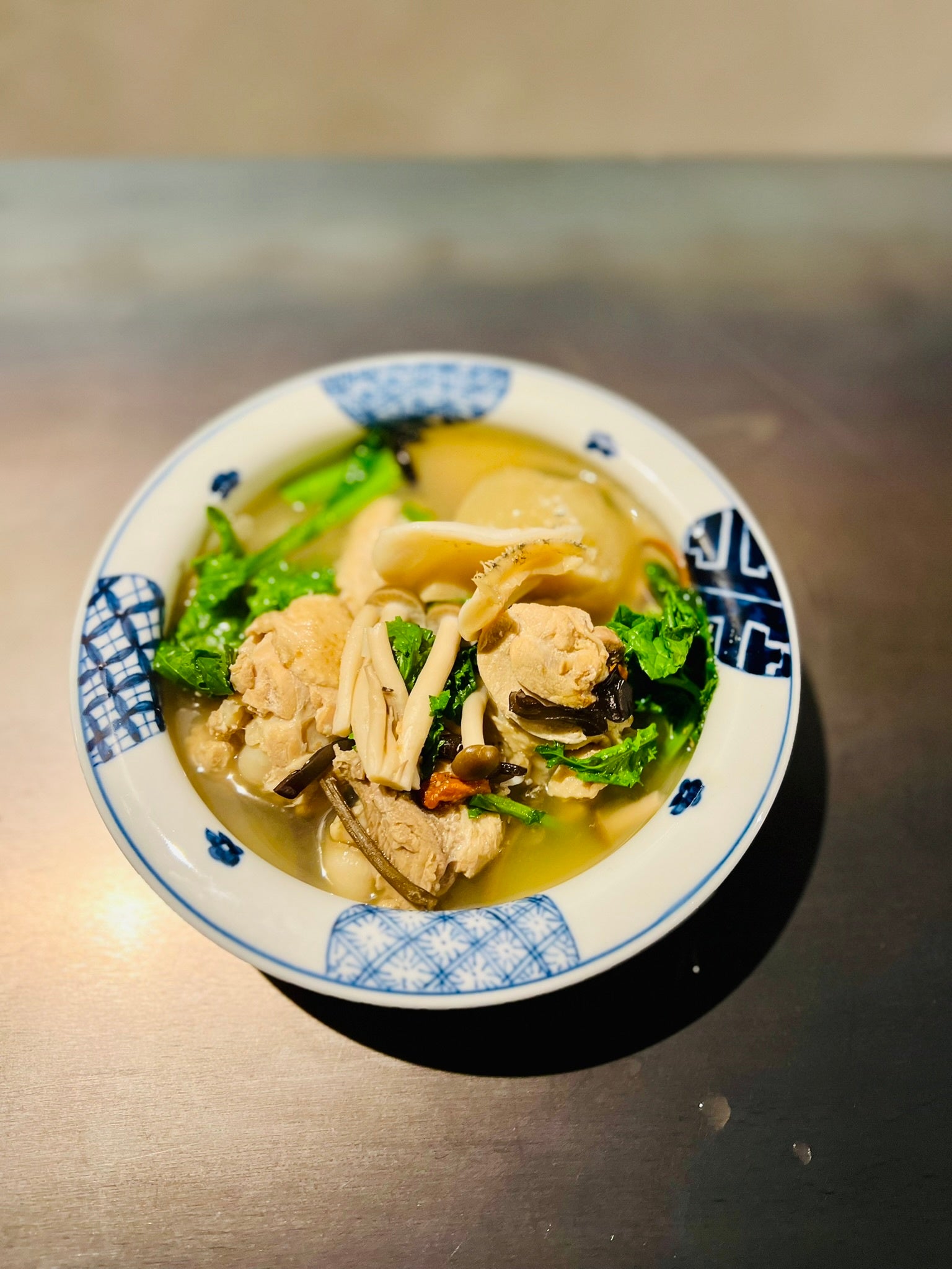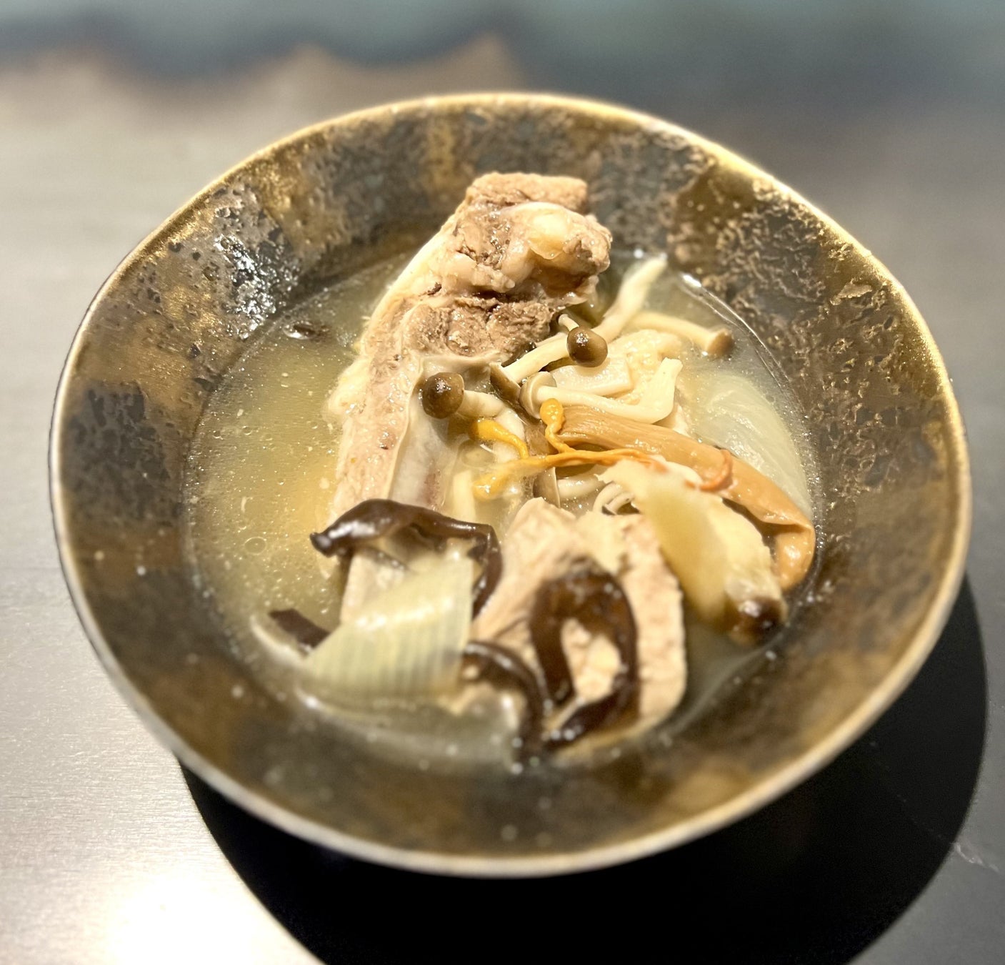 成長促進剤や抗生剤不使用のストレスフリーな豚スペアリブを使用し、有機食材の生薬と長時間蒸し上げた栄養価の高いボーンブロススープが特徴。