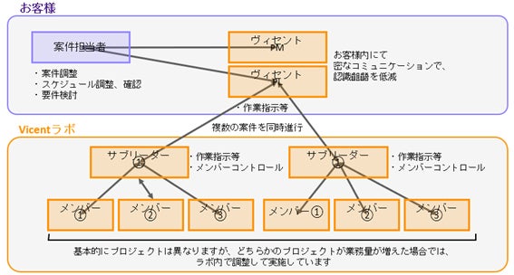 基本的な考え方として、ユーザ専属の開発チームを目的としています。その為、一つの案件やプロジェクトに囚われることなく、横断的に活用していただけます。※他のプロジェクトで要員の不足が発生した場合、VICENTラボのメンバーをアサインすることで、追加の調達コストなど削減可能です。
