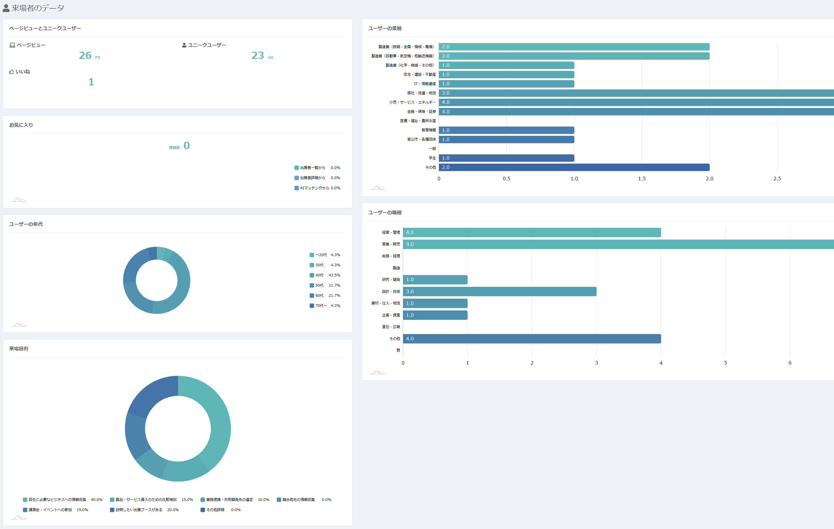 自社ブースへの来場者の属性(業種・職種・年代など)データなどを取得できるので、マーケティングツールとして活用いただけます。