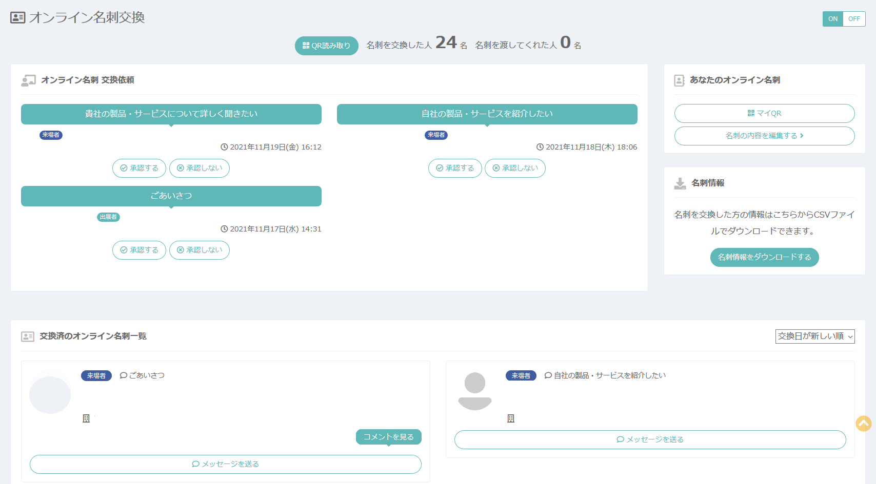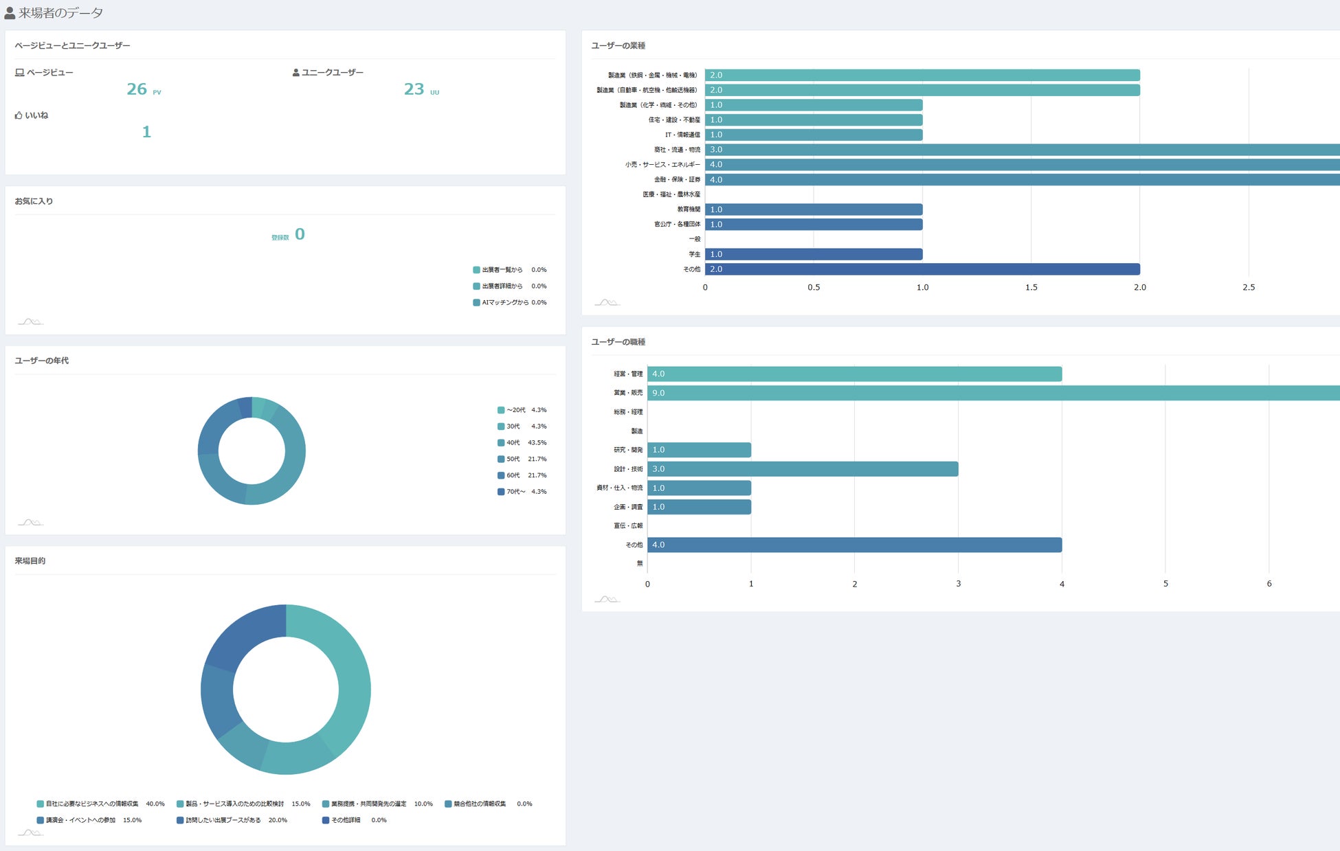 自社ブースのページビュー数や来場者の属性データなどが取得できるほか、名刺交換データの閲覧、ダウンロードなどができます。