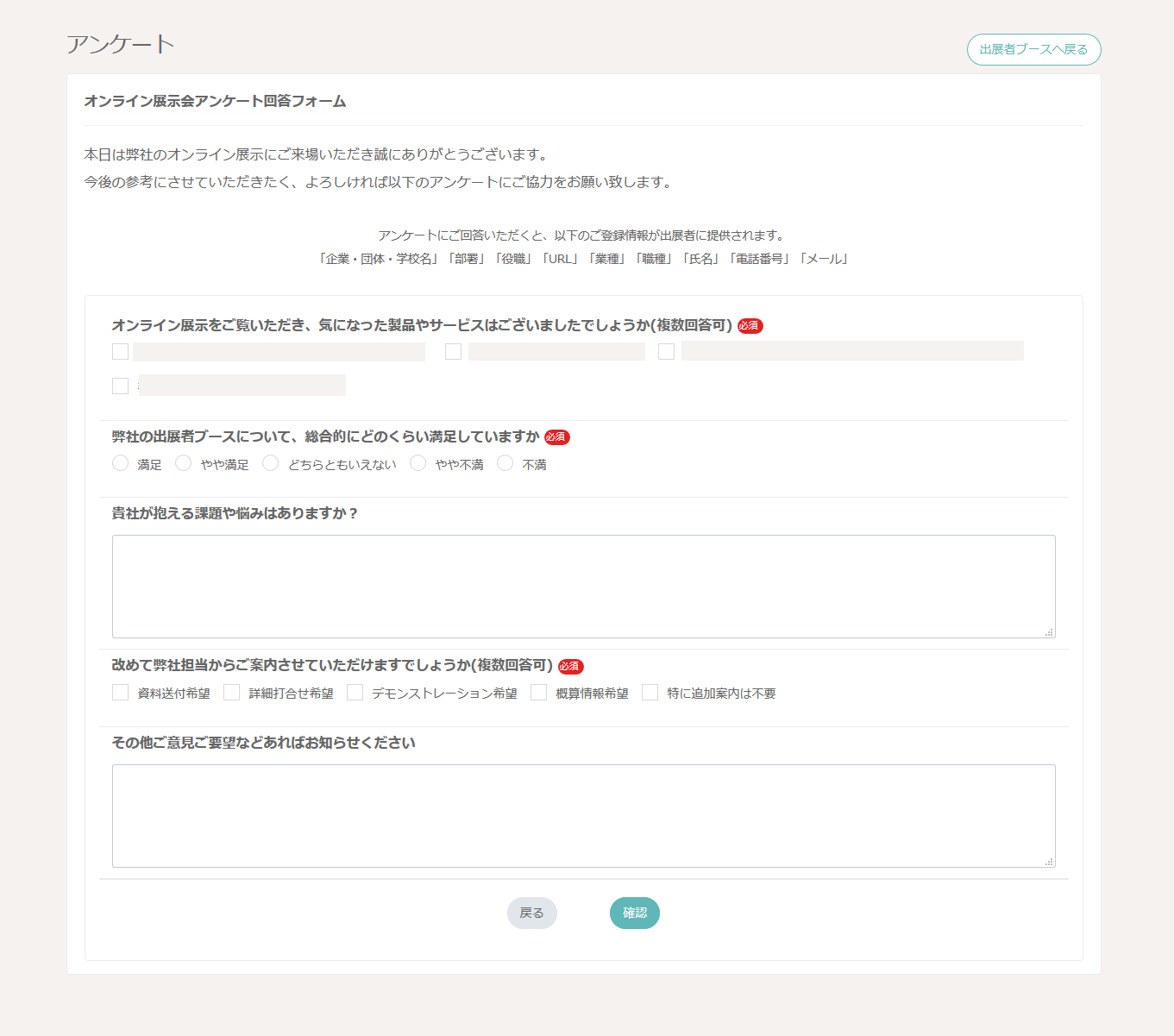 製品情報(1~5点)、企業PR動画、PDF資料(1~4点)、独自のアンケートを掲載可能。PDF資料をダウンロードした来場者、アンケートに回答した来場者の情報を取得できます